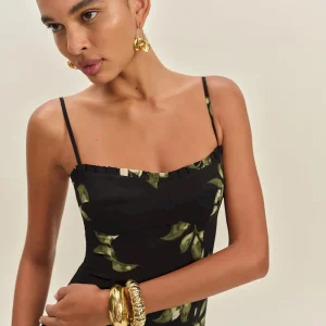 The model is wearing a size 0 and is 5’11”, 24″ waist, 35″ hips, 31″ bust.