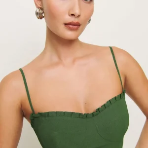 The model is wearing a size 0 and is 5’9″, 24″ waist, 34″ hips, 31″ bust.
