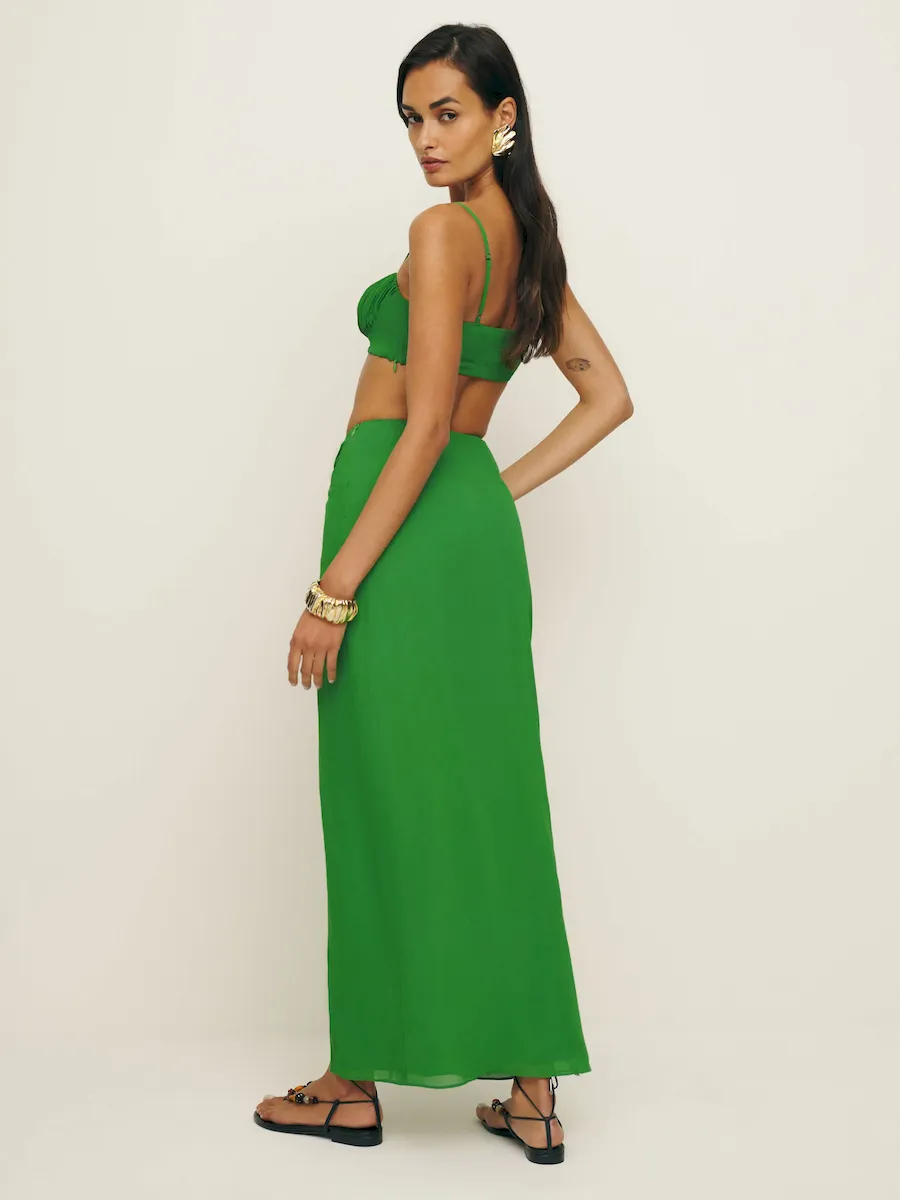 The model is wearing a size 0 and is 5’9″, 25″ waist, 35″ hips, 32″ bust.