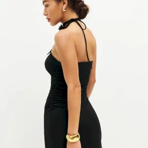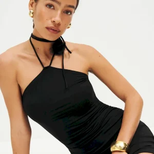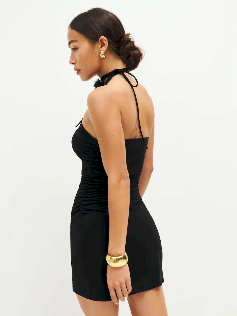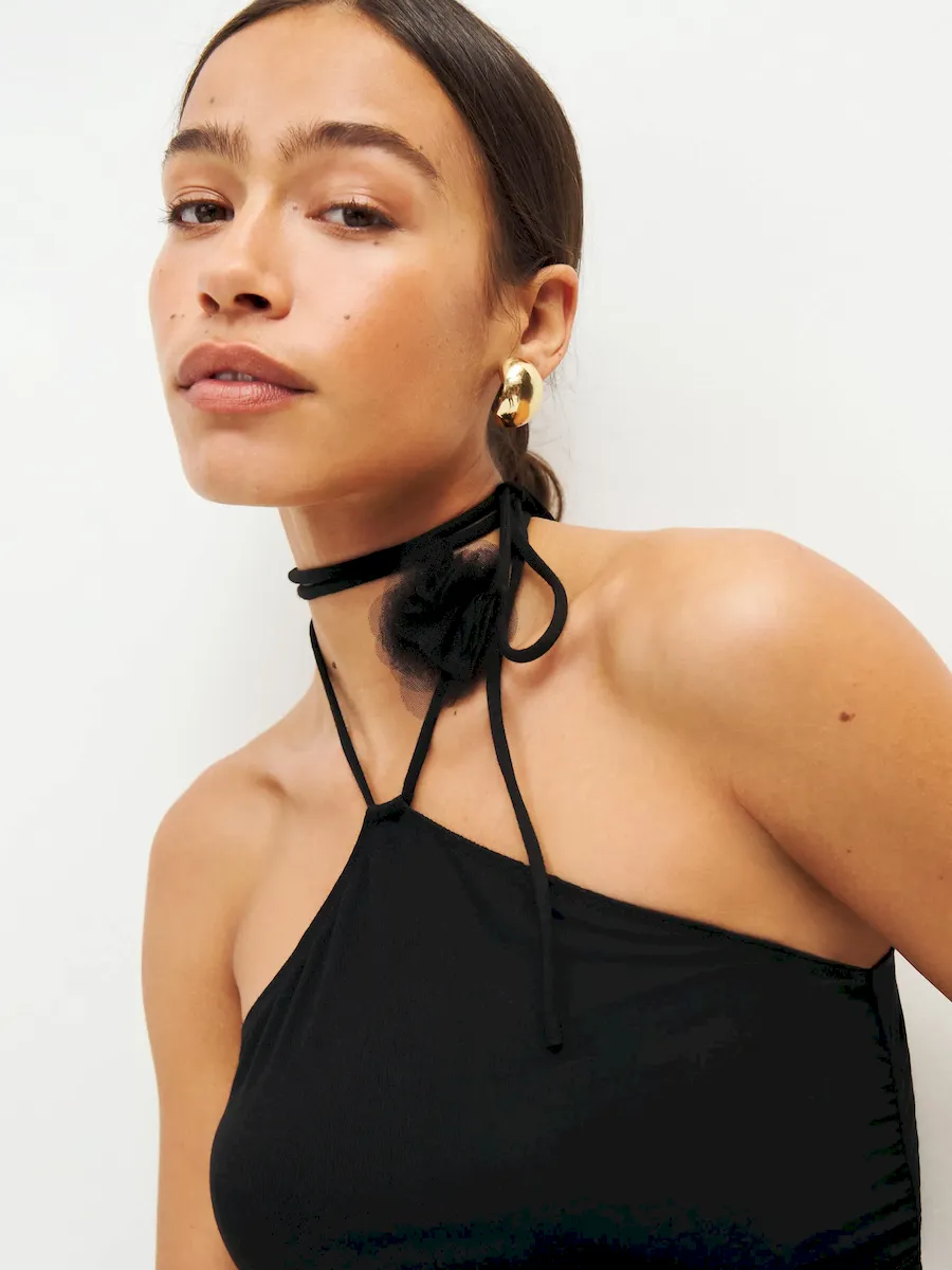adjustable straps, halter neckline.