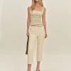 The model is wearing a size 0 and is 5′ 9.5″, 24″ waist, 34.5″ hips, 34″ bust.