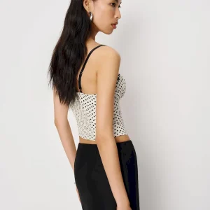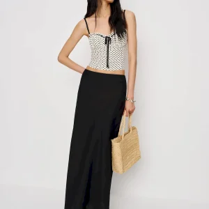The model is wearing a size 0 and is 5’10”, 24.5″ waist, 34.5″ hips, 31″ bust.