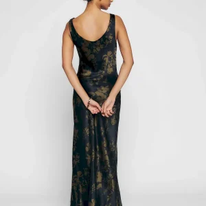 The model is wearing a size 0 and is 5’10”, 23.5″ waist, 34″ hips, 32″ bust.