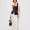 The model is wearing a size XS and is 5′ 9.5″, 24″ waist, 34.5″ hips, 34″ bust.