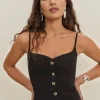 The model is wearing a size 14 and is 5’9.5″, 29″ waist, 43.5″ hips, 39.5″ bust.