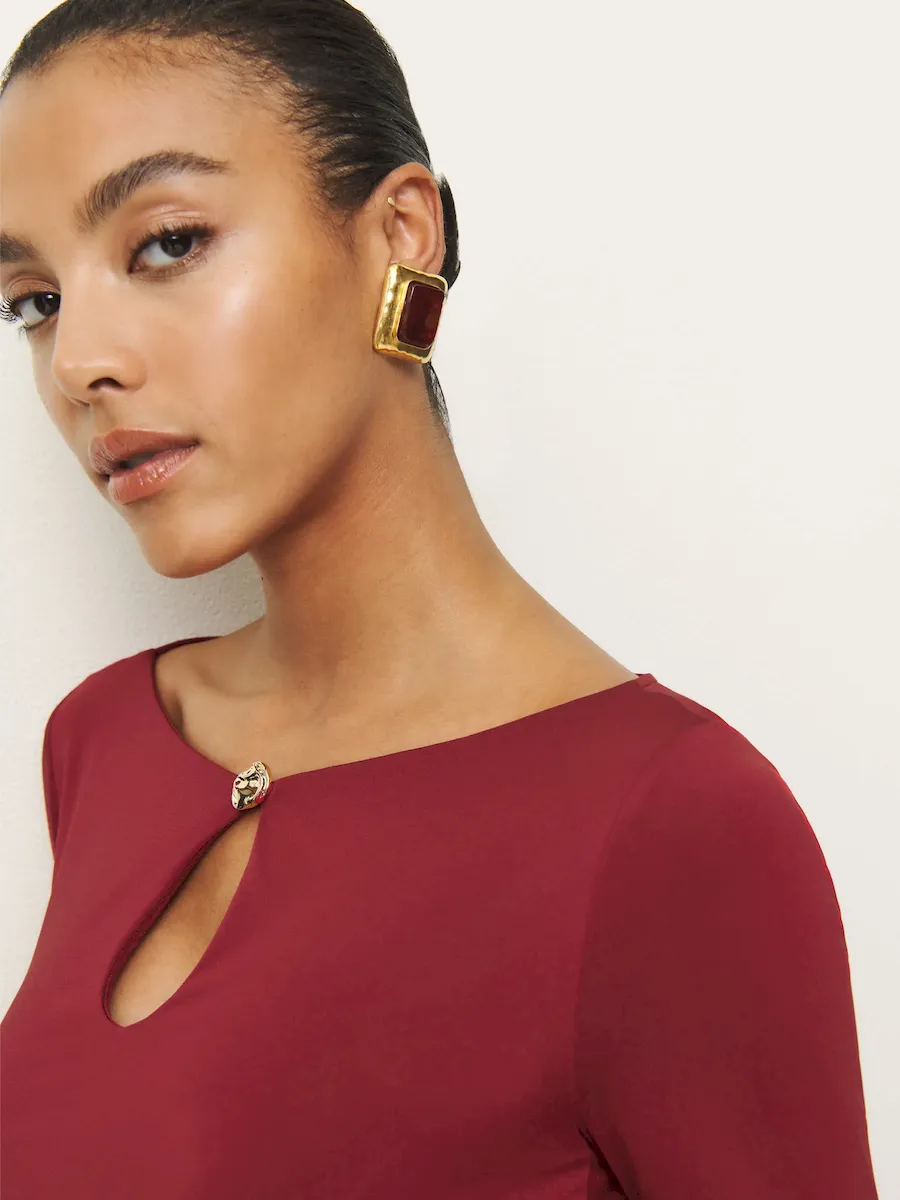The model is wearing a size S and is 5’11”, 26″ waist, 38″ hips, 35″ bust.