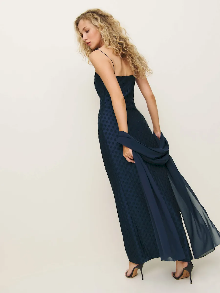 The model is wearing a size 0 and is 5’10”, 23″ waist, 35.5″ hips, 32.5″ bust.
