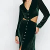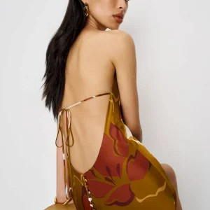 The model is wearing a size 0 and is 5’8″, 23″ waist, 35.5″ hips, 30″ bust.