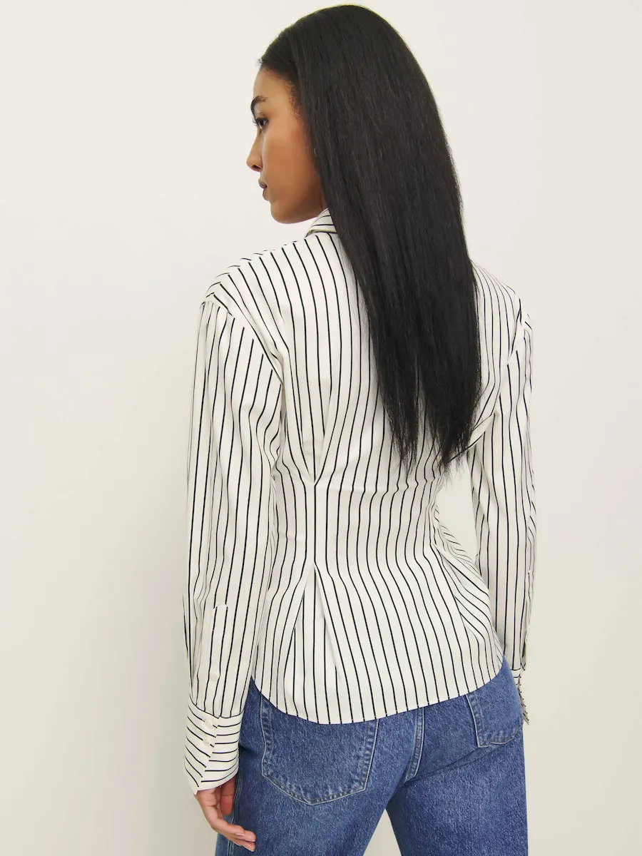 The model is wearing a size 4 and is 5’11”, 26″ waist, 38″ hips, 35″ bust.