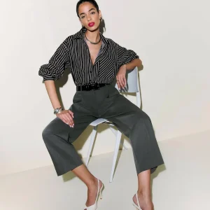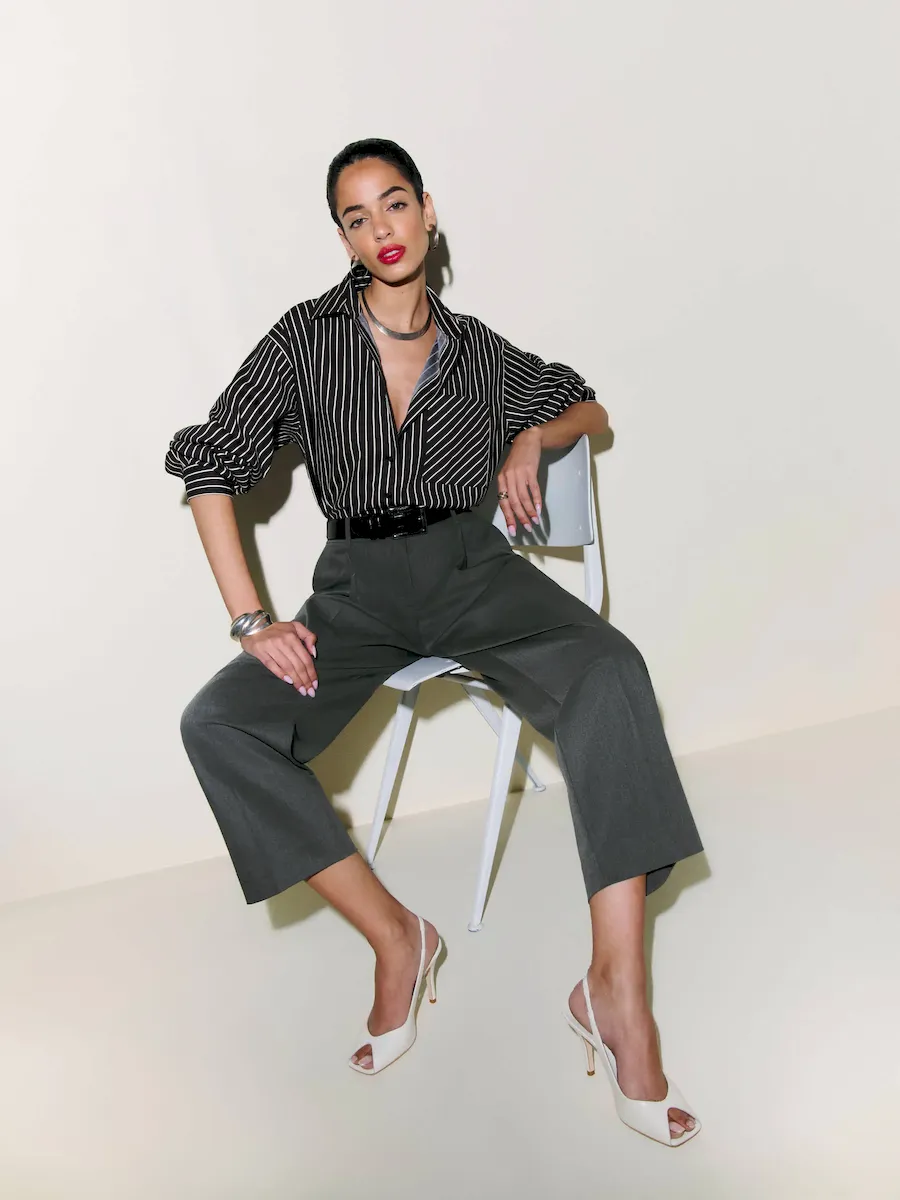 The model is wearing a size 0 and has a 24″ waist, 36″ hips.
