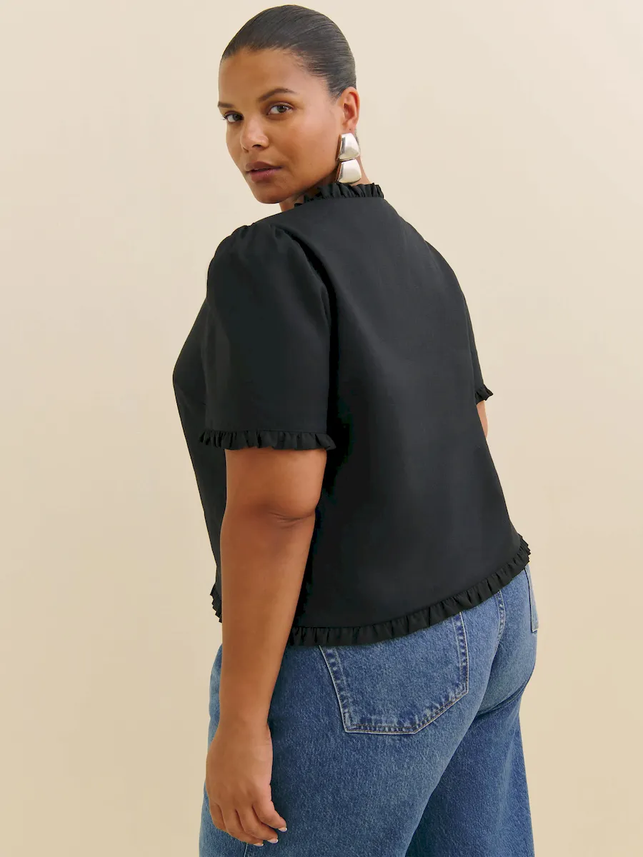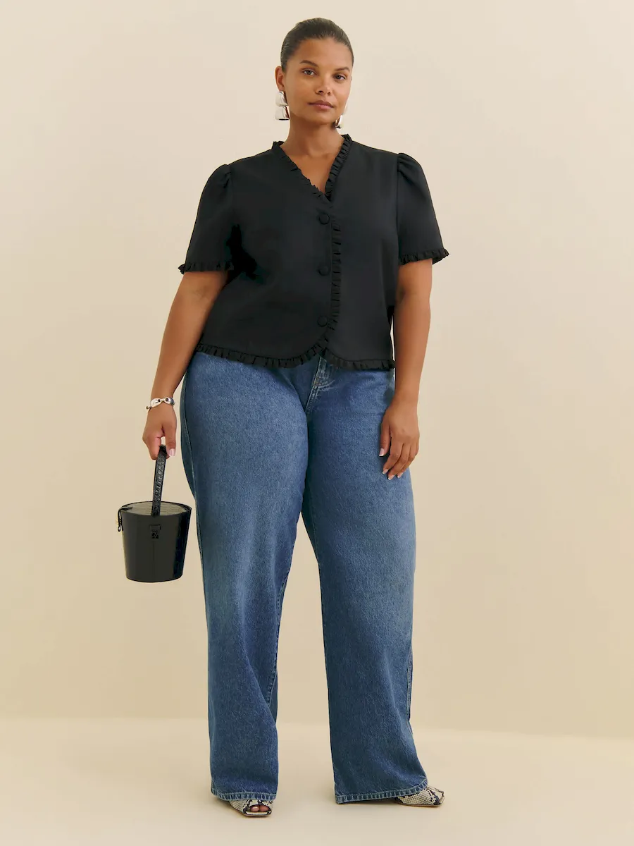 The model is wearing a size 1X and is 5’8″, 33″ waist, 50″ hips, 42″ bust.