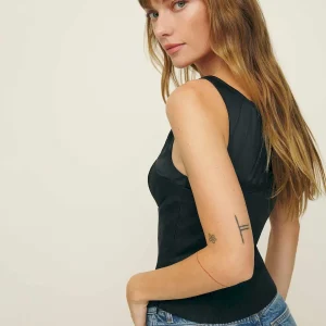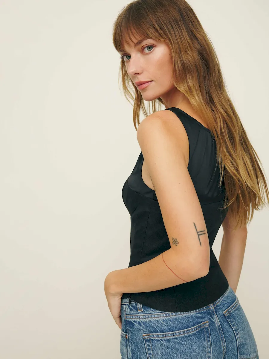 The model is wearing a size 0 and is 5’10”, 25″ waist, 34.5″ hips, 31″ bust.