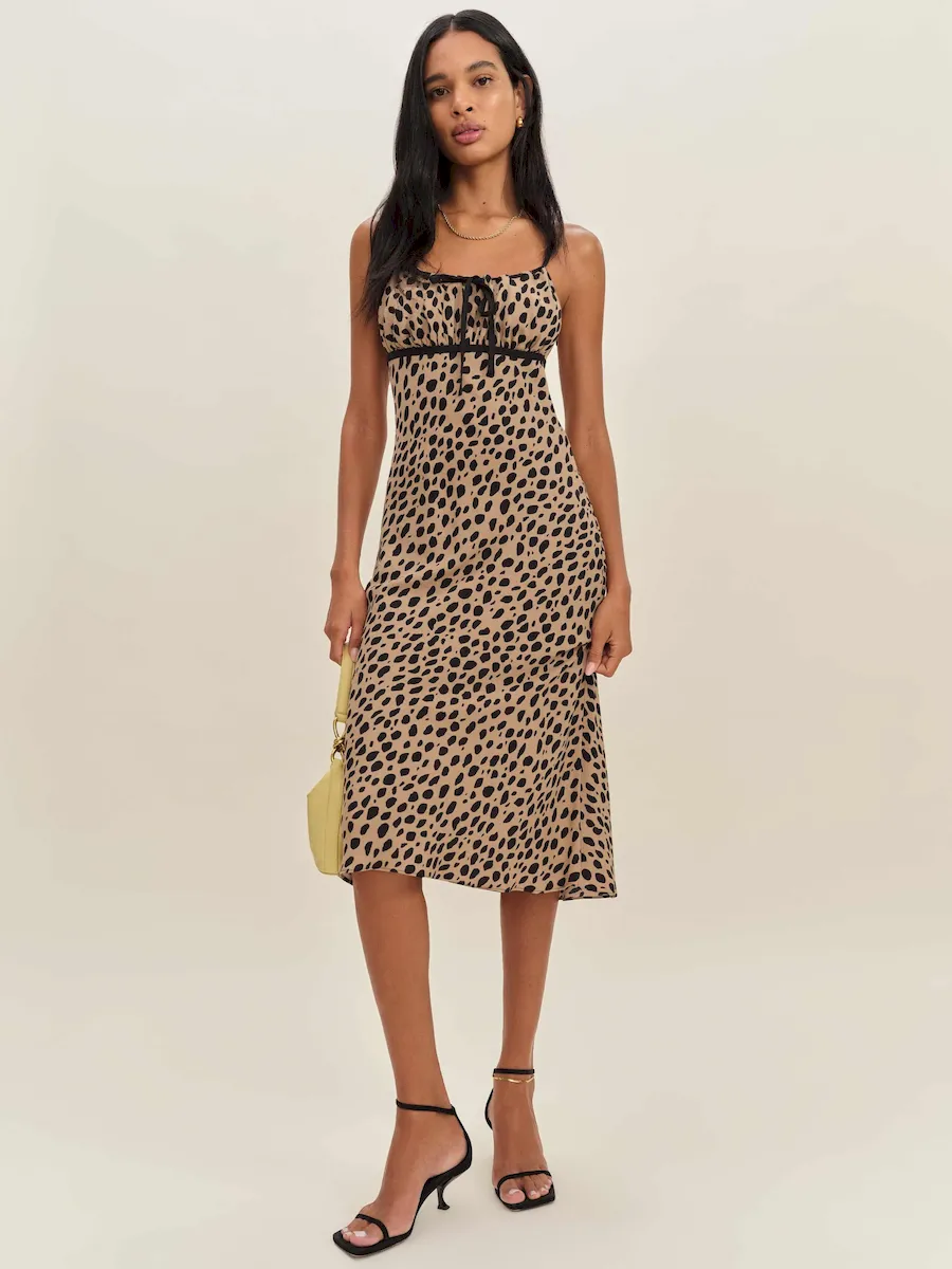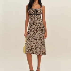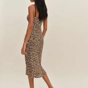 The model is wearing a size 0 and is 5’11”, 24″ waist, 35″ hips, 31″ bust.
