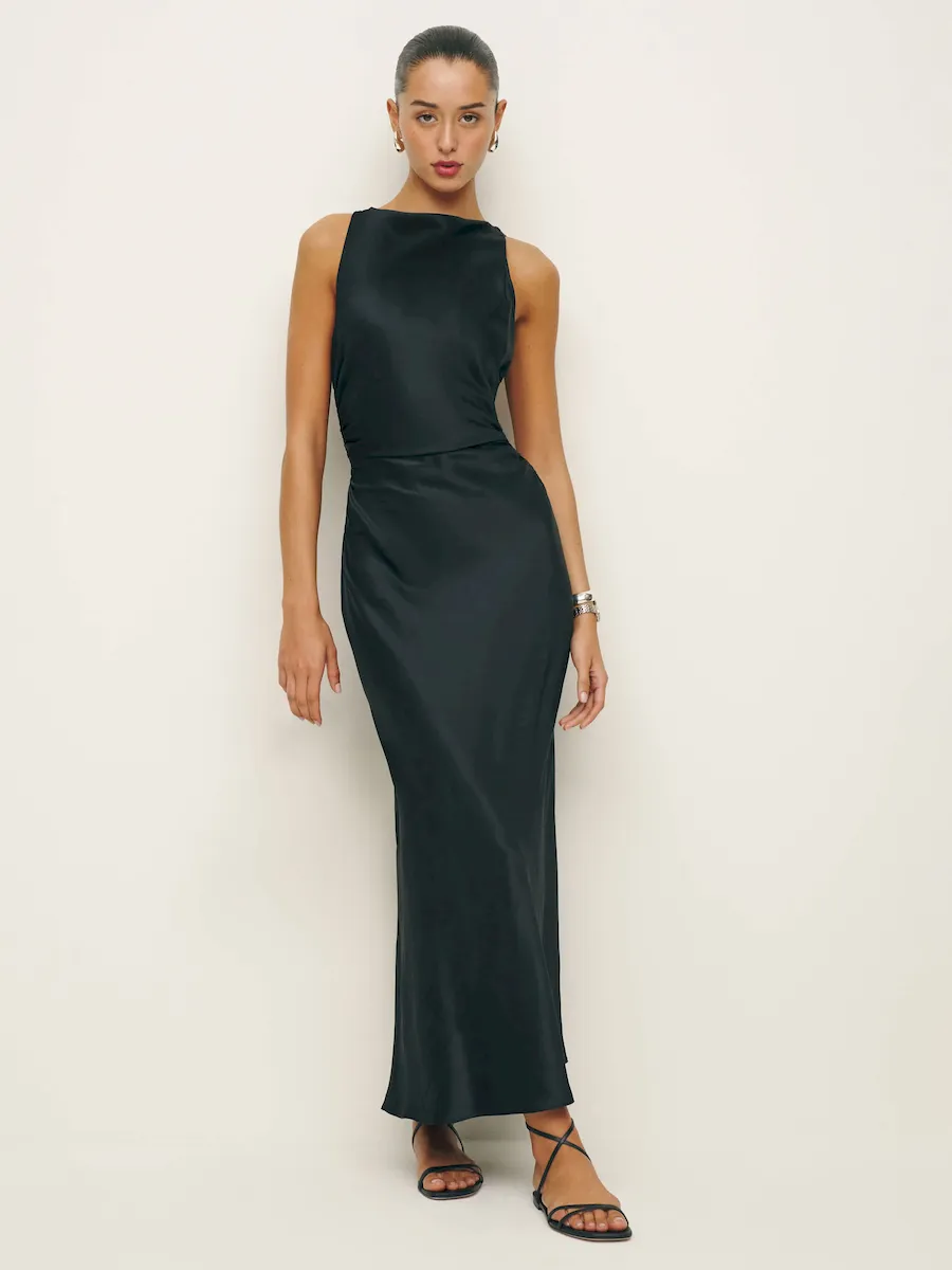 non-adjustable straps, cowl neckline.