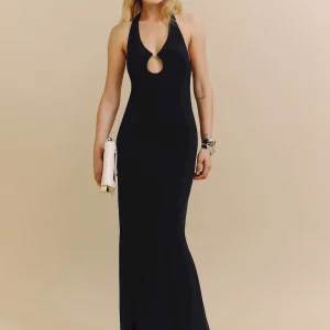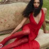 The model is wearing a size 0 and is 5’10”, 24″ waist, 33.5″ hips, 30″ bust.
