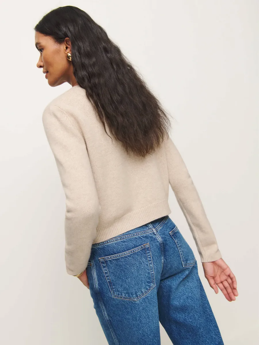 This is a fine-gauge recycled cashmere blend sweater knit – 95% Recycled Cashmere, 5% Cashmere.