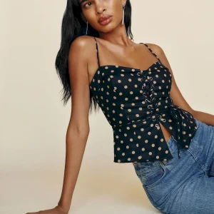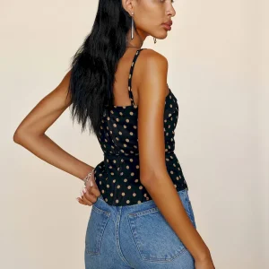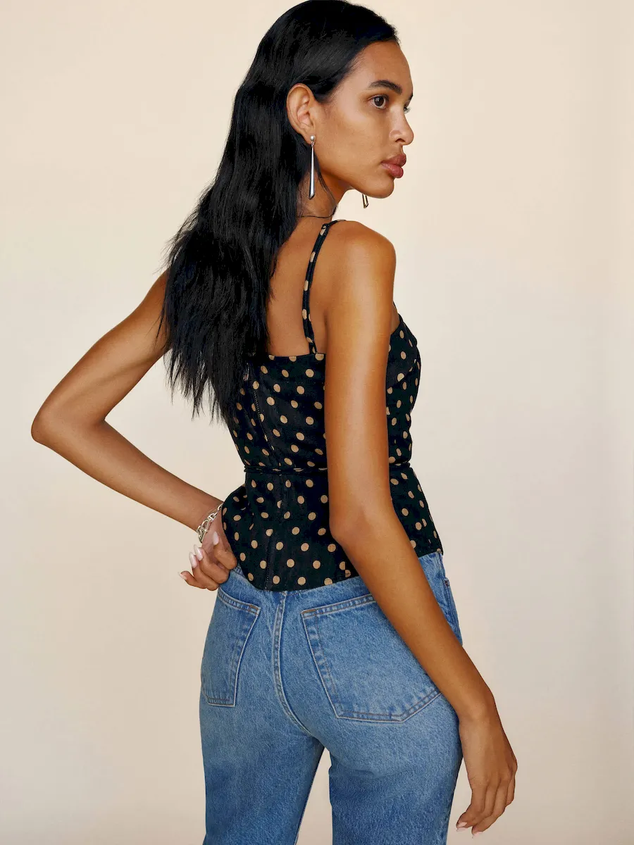 The model is wearing a size 0 and is 5’11”, 24″ waist, 35″ hips, 31″ bust.