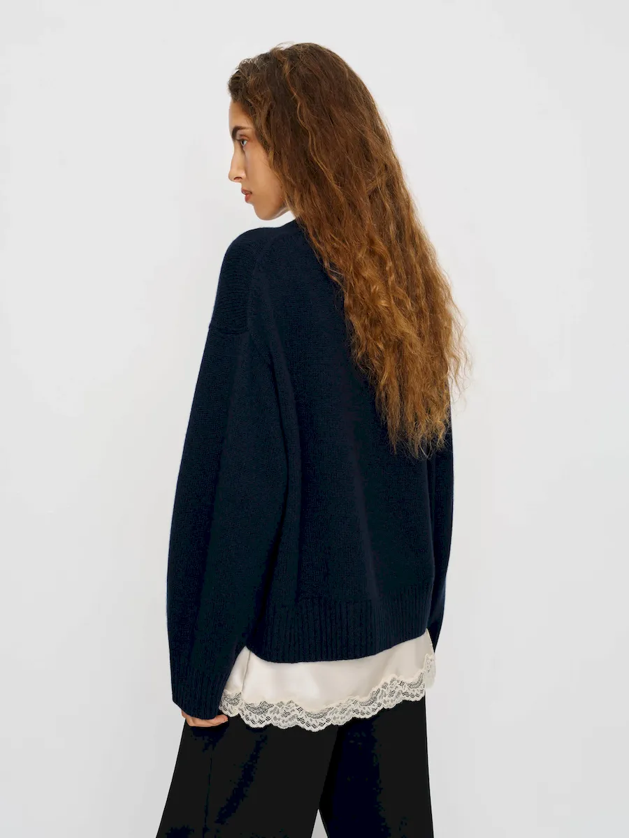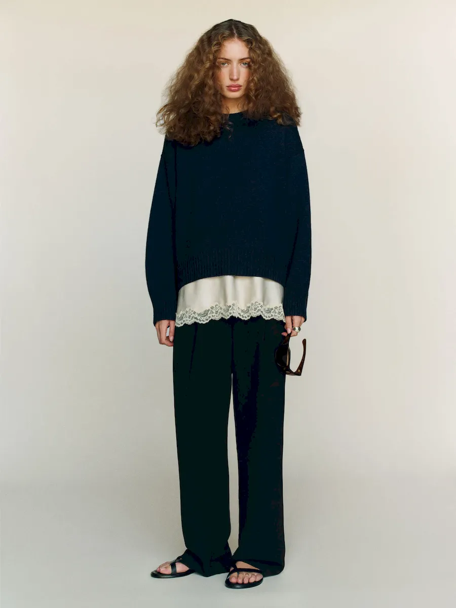 Nothing new here except this yarn made with all recycled materials. Mostly recycled cashmere, but also some recycled wool, and zero new, virgin fibers. Our new most recycled blend ever, same commitment to carbon reduction and circularity. This is a medium-weight recycled cashmere blend sweater knit from 95% Recycled Cashmere, 5% Recycled Wool. Soft as cashmere but now 100% recycled. Hand wash + dry flat. More onfabric & care.