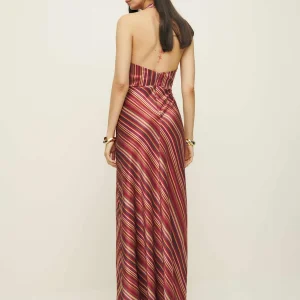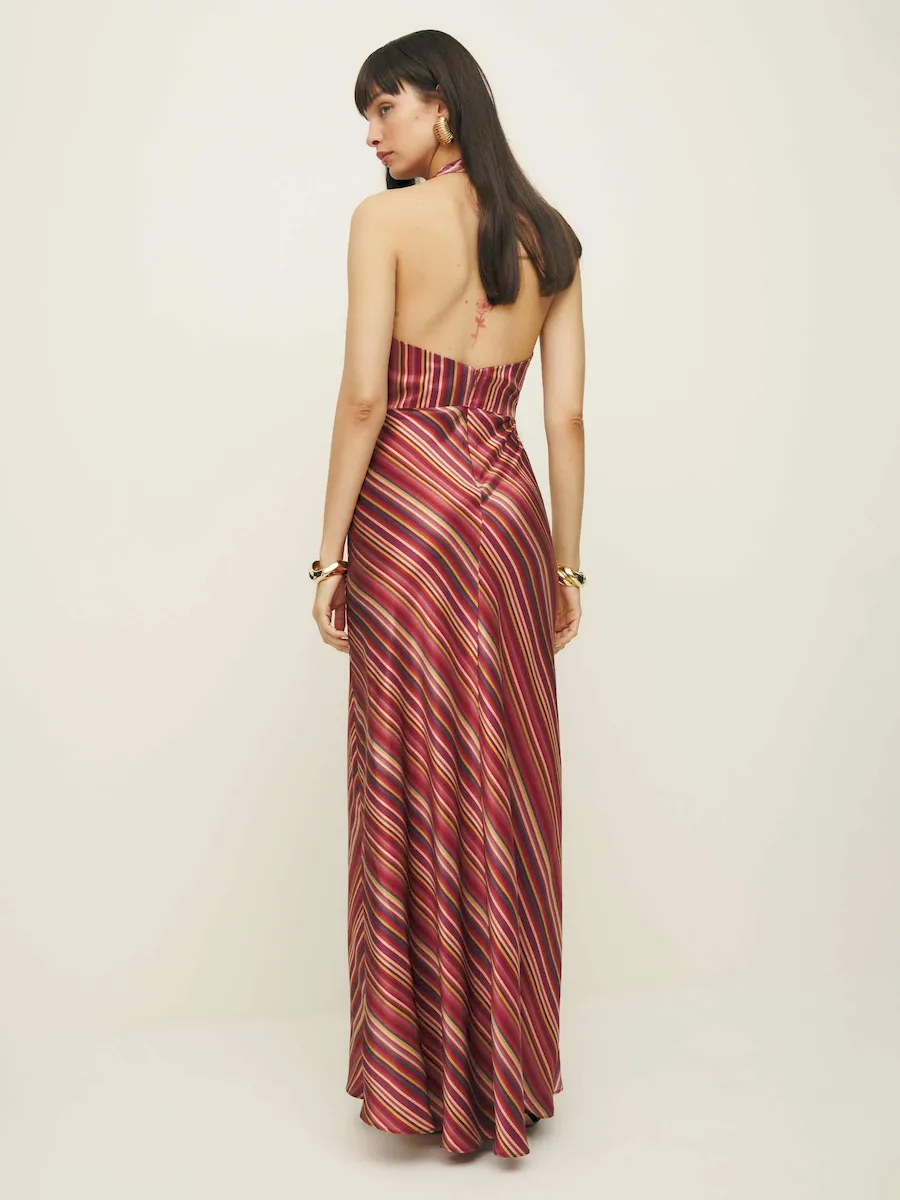 The model is wearing a size 0 and is 5’10”, 25″ waist, 35″ hips, 32″ bust.