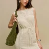 adjustable tie beltand button closure.