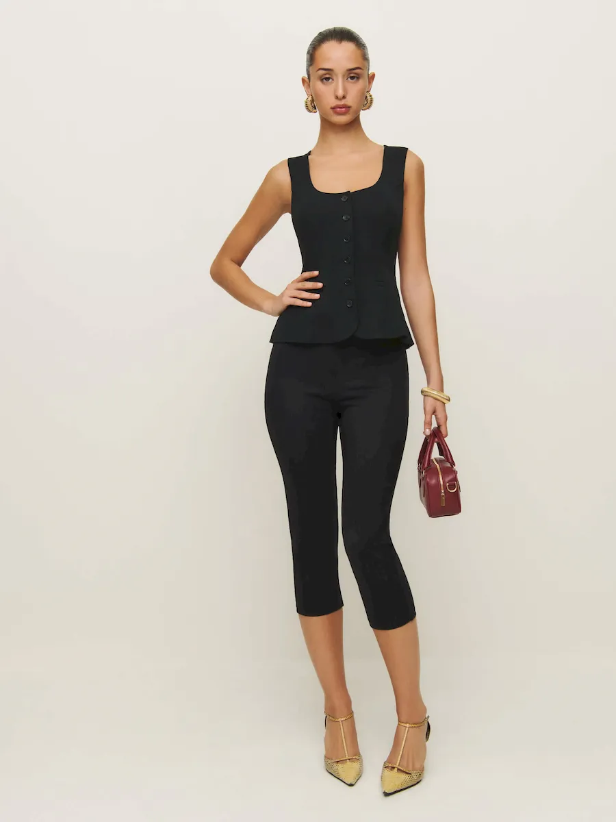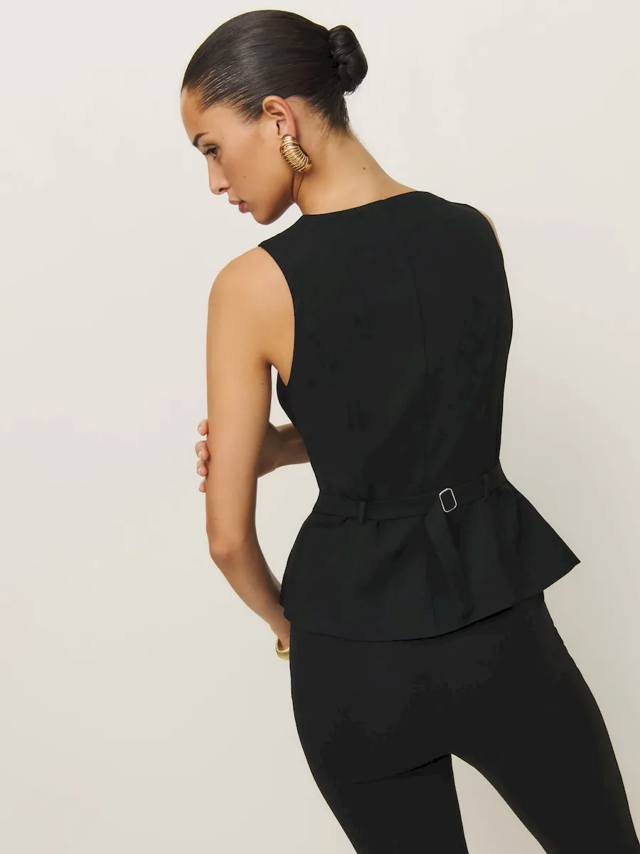 The model is wearing a size 0 and is 5’8″, 23″ waist, 35.5″ hips, 30″ bust.
