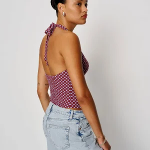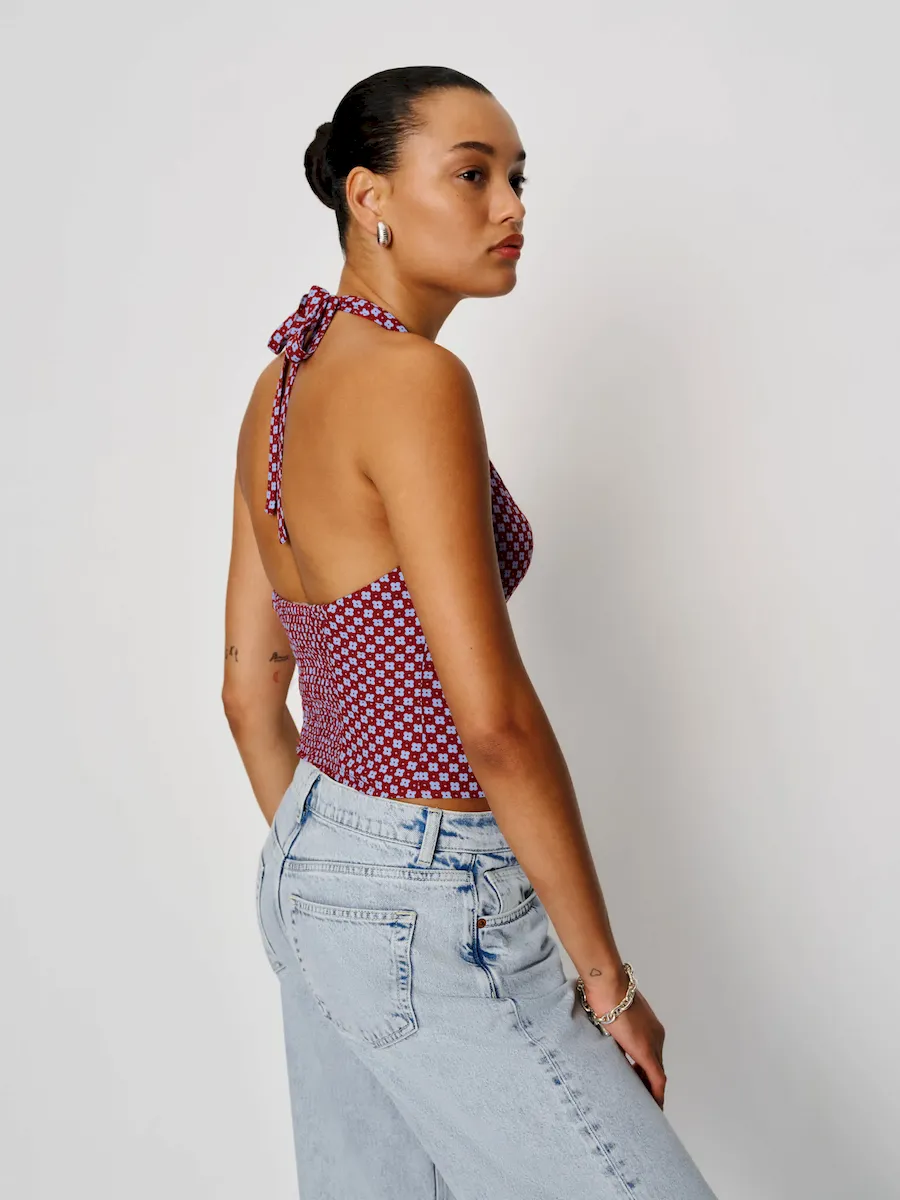 The model is wearing a size 0 and is 5’10”, 23″ waist, 34″ hips, 32″ bust.