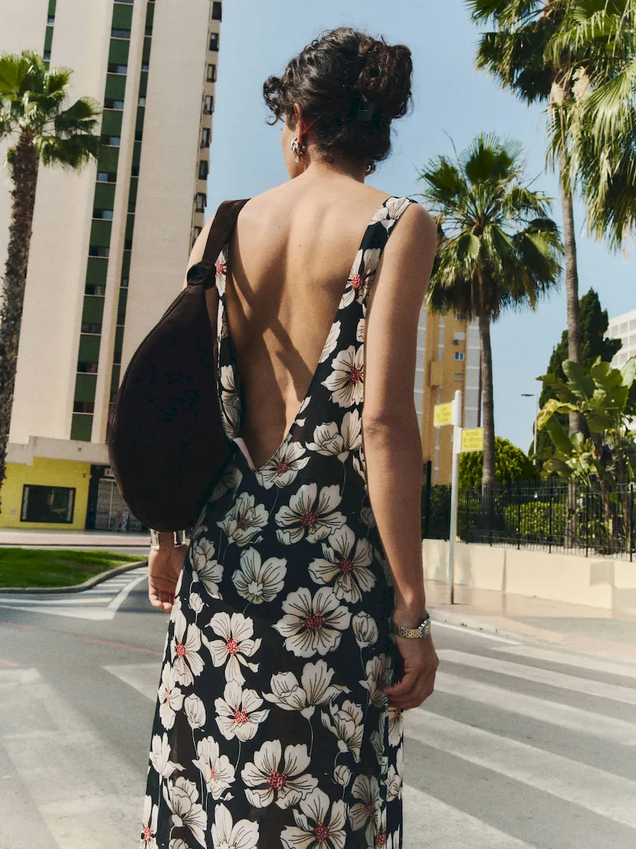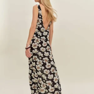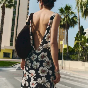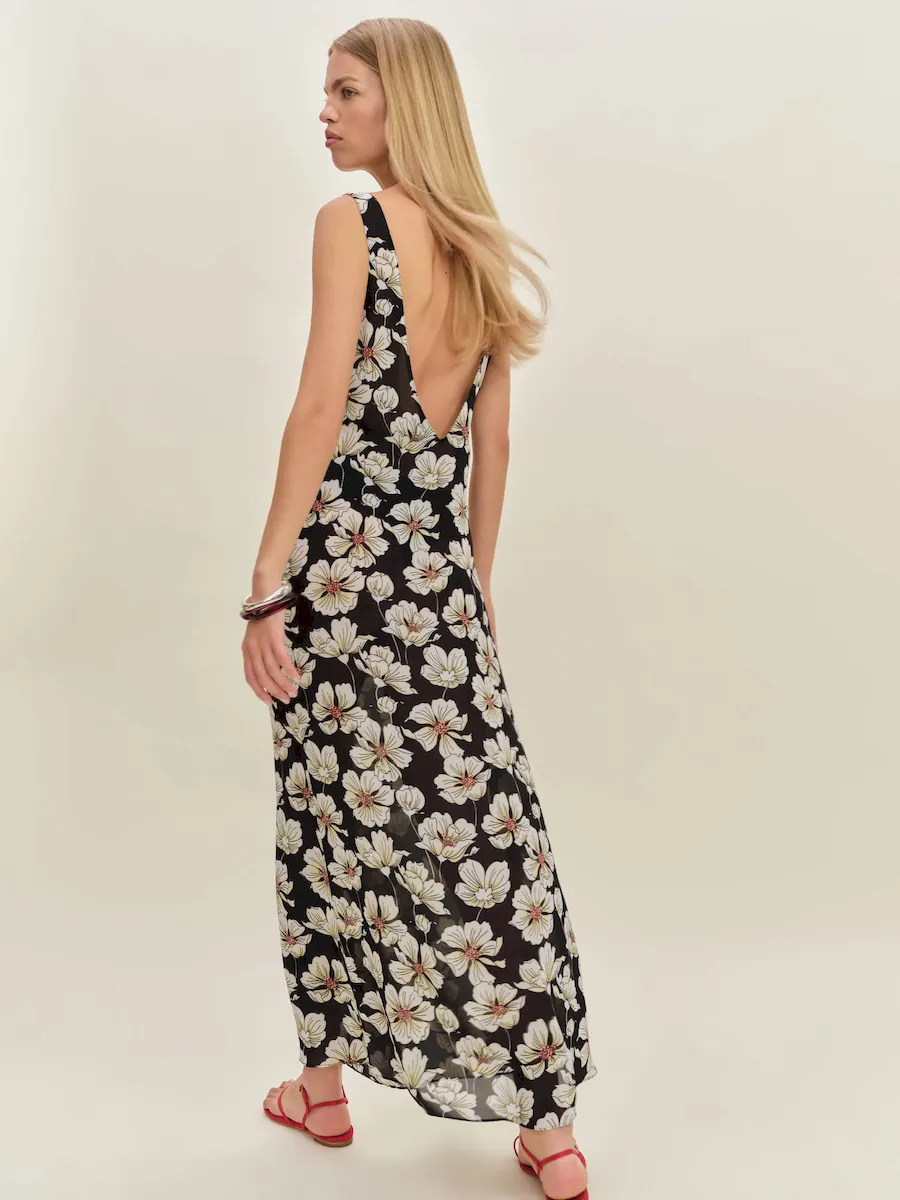The model is wearing a size 0 and is 5’10”, 24″ waist, 35″ hips, 31″ bust.