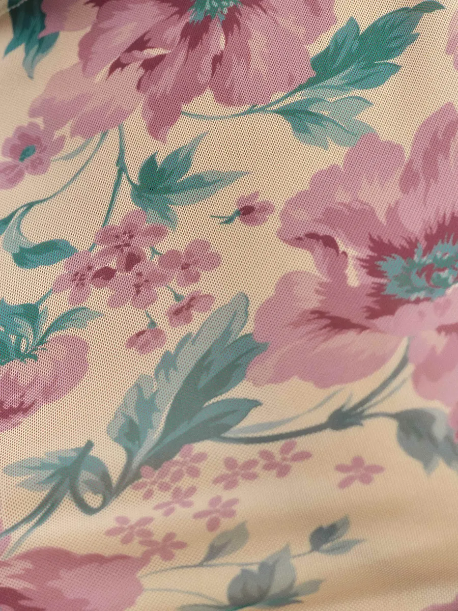 This is a deadstock mesh fabric made from 90% Polyester and 10% Spandex. Hand wash + dry flat. More onfabric & care.