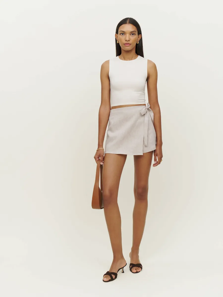The model is wearing a size 0 and has a 24″ waist, 34″ hips.