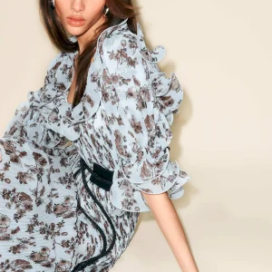 The model is wearing a size 2 and is 5’10”, 23″ waist, 34″ hips, 31″ bust.