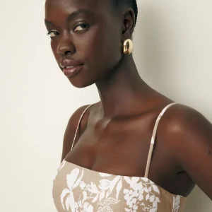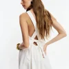 The model is wearing a size 0 and is 5’10”, 25″ waist, 35″ hips, 32″ bust.