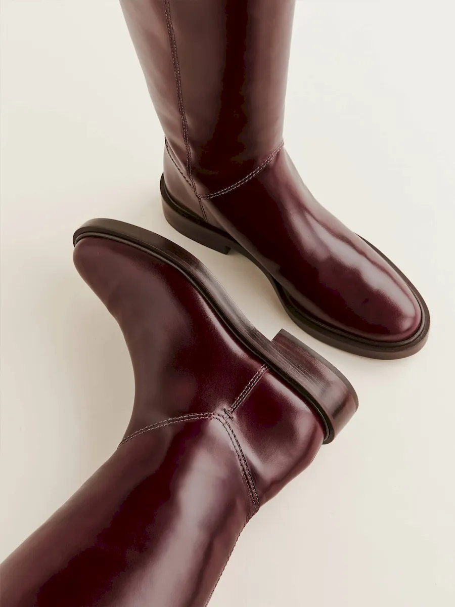 Tailored two tone leather with glossy effect. This vegetable tanned leather is initially firm but will soften over time. Spot clean. More onfabric & care.