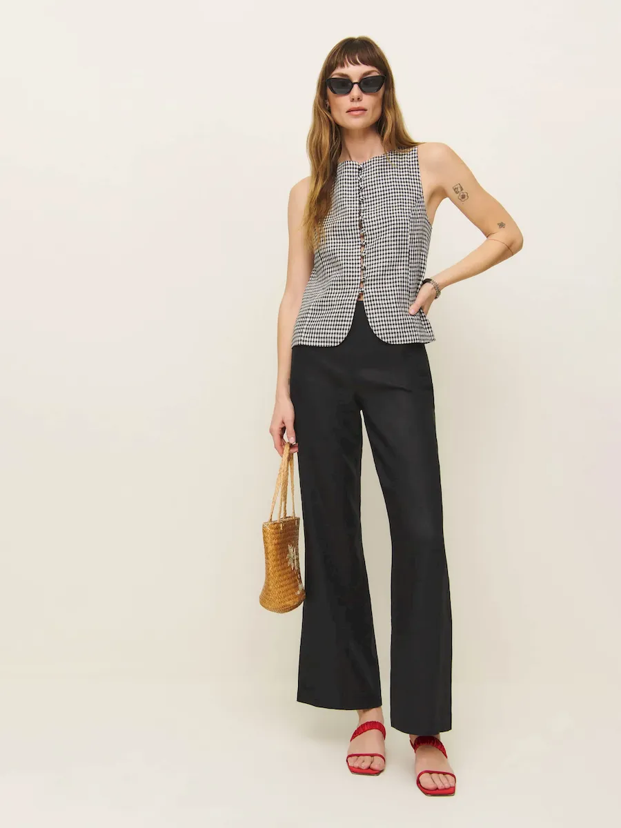 The model is wearing a size 0 and has a 25″ waist, 34.5″ hips.