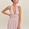 The model is wearing a size 0 and is 5’10”, 25″ waist, 34.5″ hips, 31″ bust.