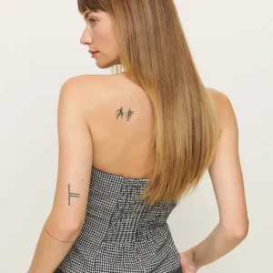 The model is wearing a size 0 and is 5’10”, 25″ waist, 34.5″ hips, 31″ bust.