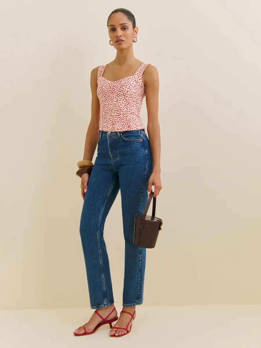 The model is wearing a size 0 and is 5’10”, 23″ waist, 35.5″ hips, 32.5″ bust.