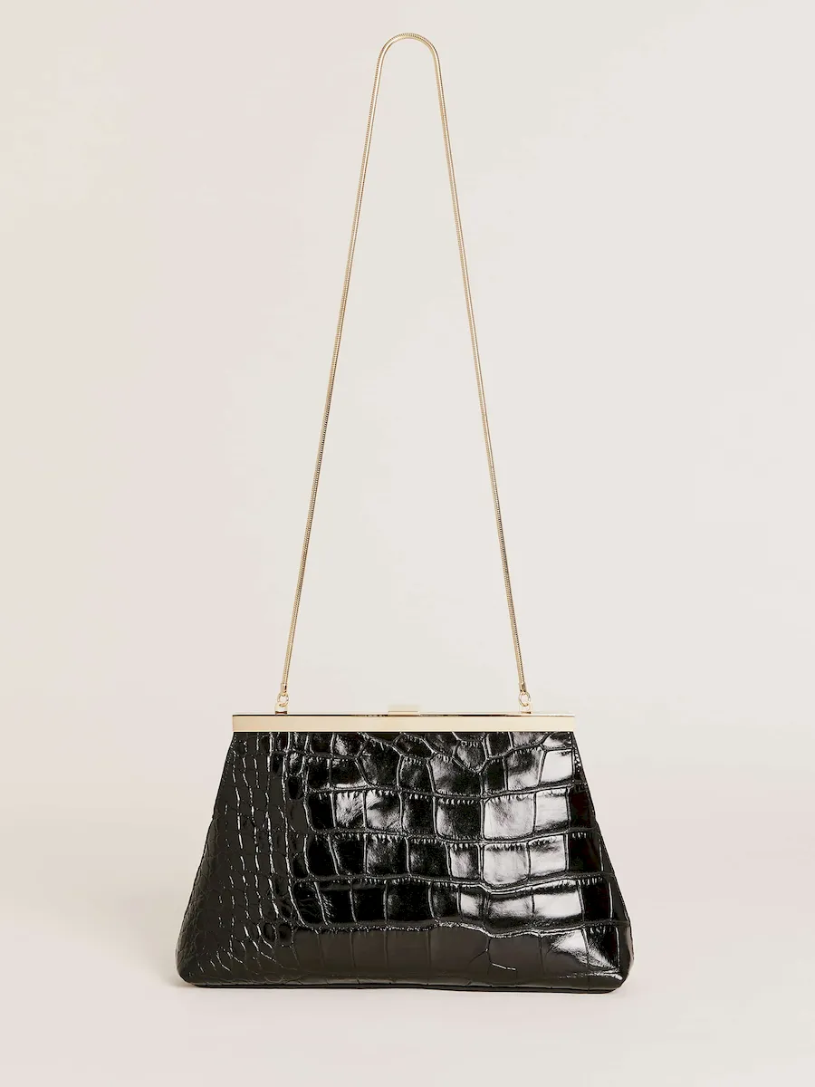 a vintage inspired clutch with a chain shoulder strap.