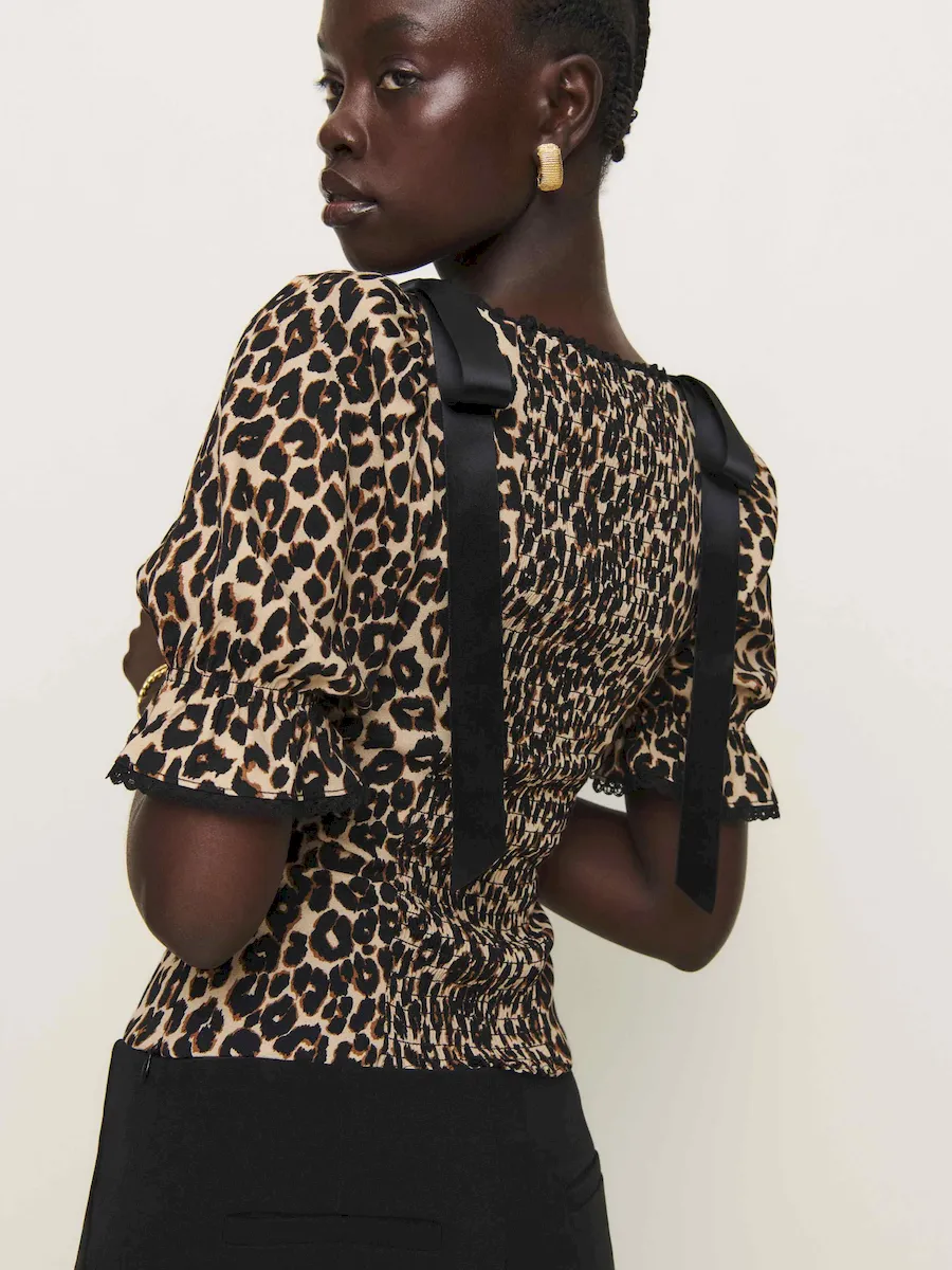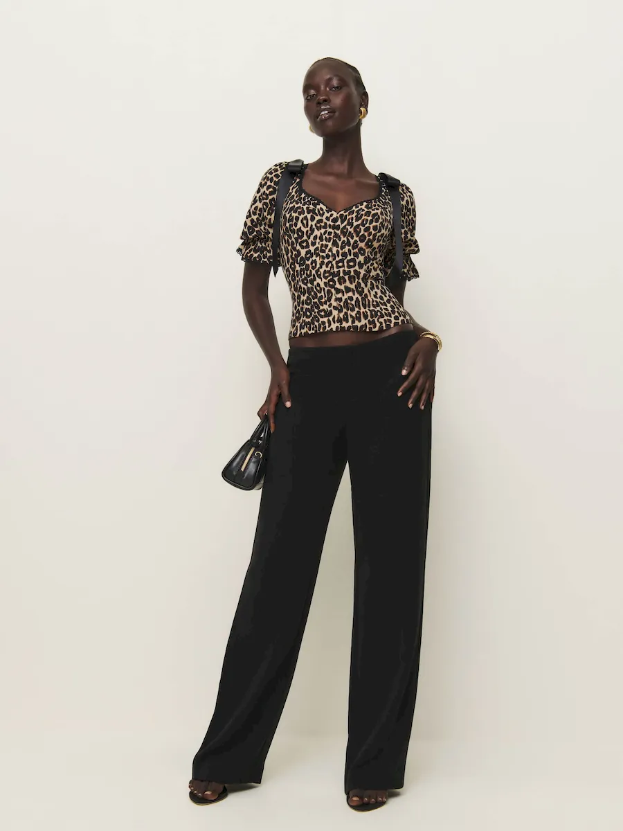 The model is wearing a size 0 and is 5’10”, 25″ waist, 35″ hips, 32″ bust.