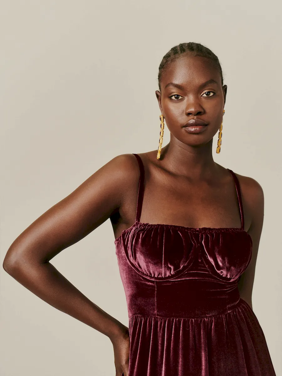 This is a soft, non-stretch velvet with a medium pile – 82% rayon, 18% silk Dry clean only. More onfabric & care.