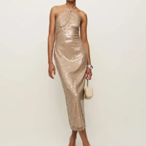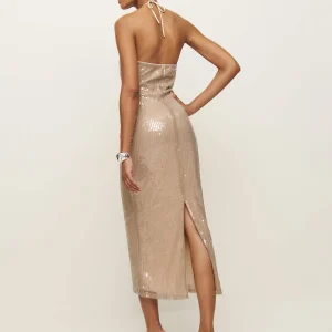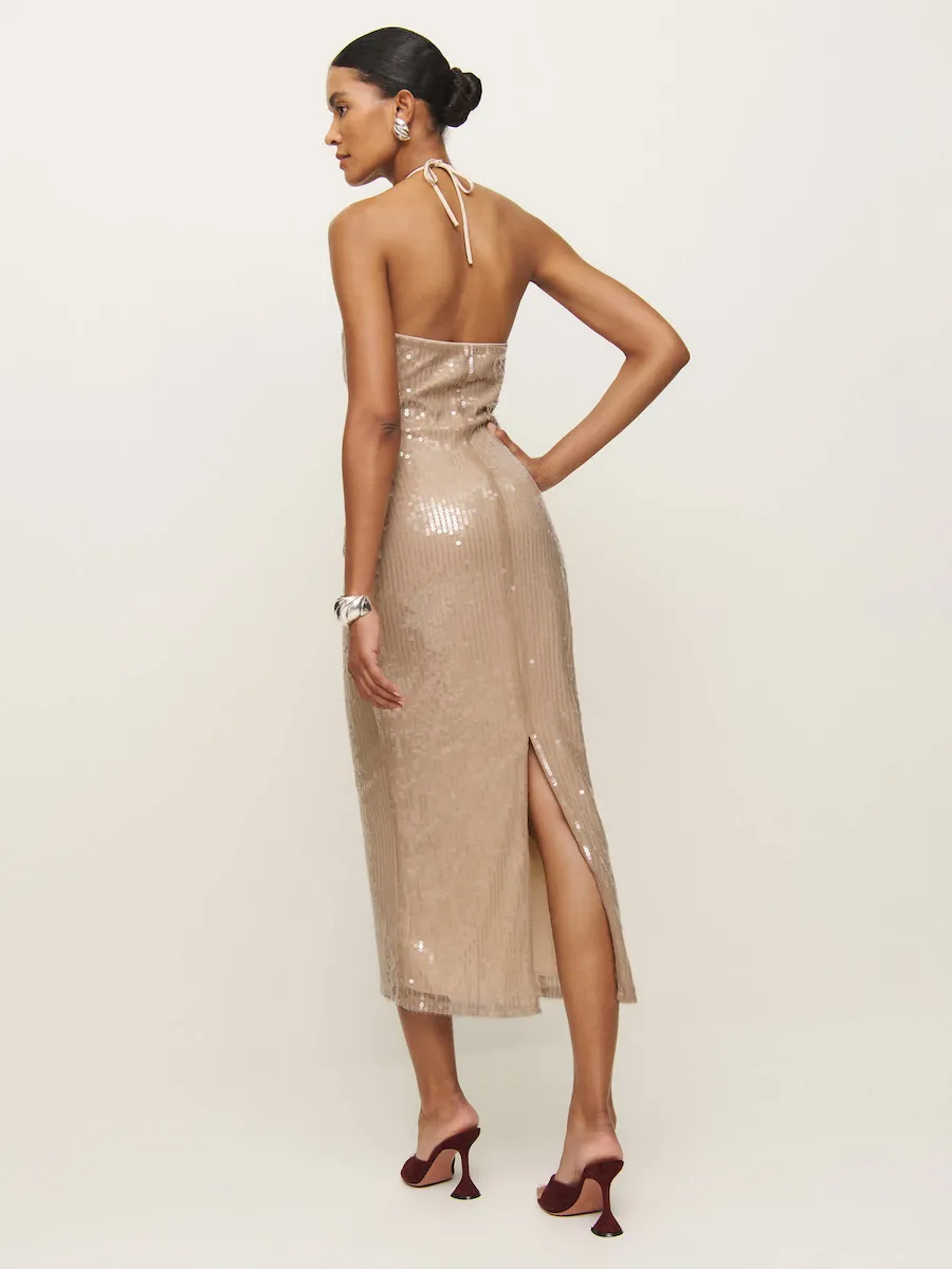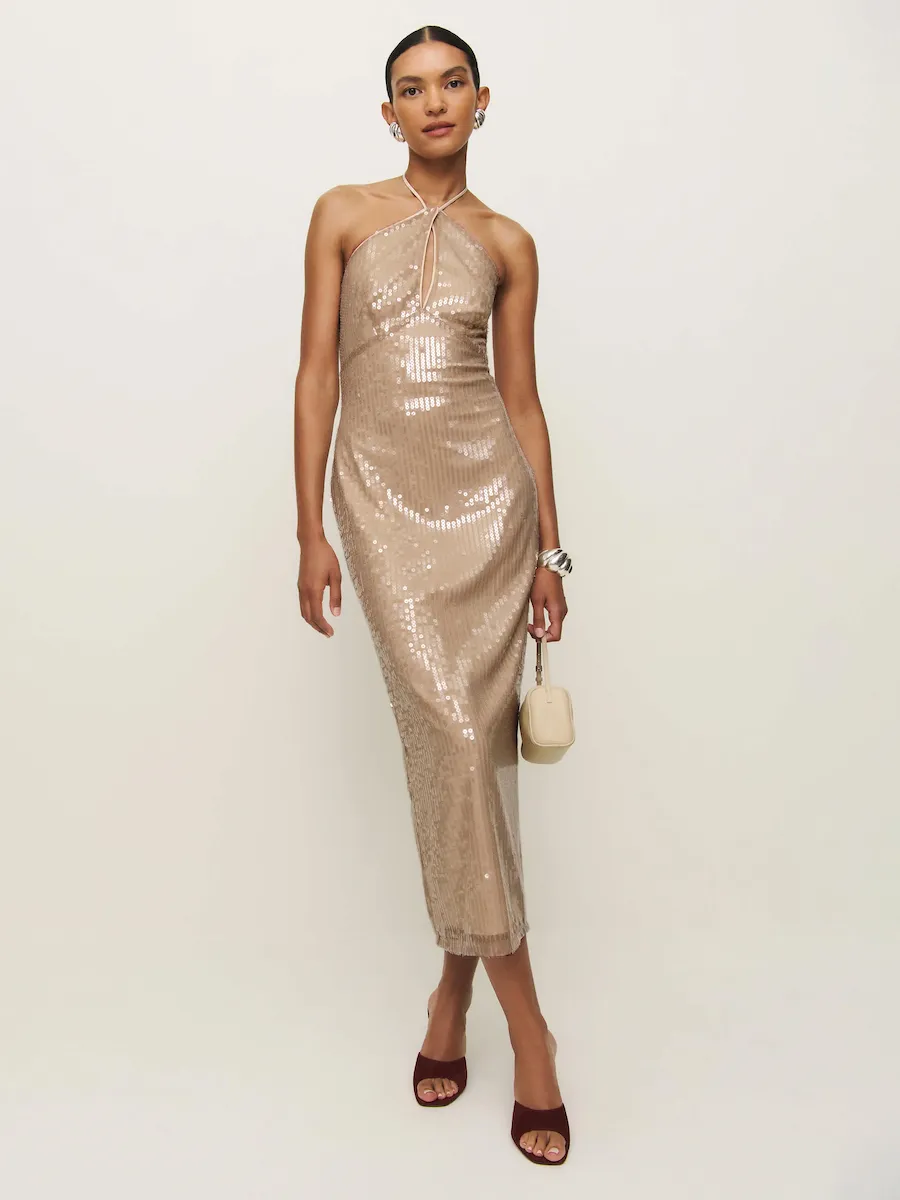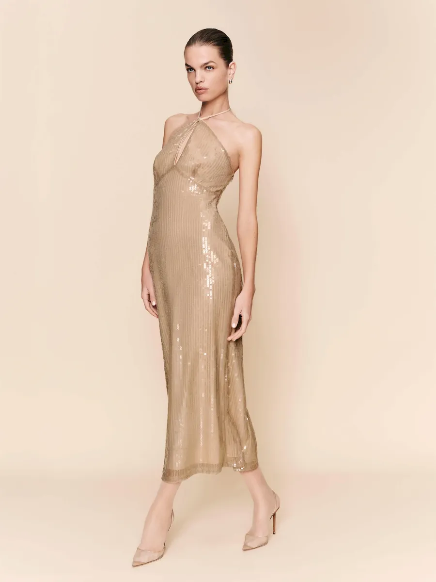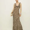 The model is wearing a size 0 and is 5’10”, 24″ waist, 35″ hips, 31″ bust.