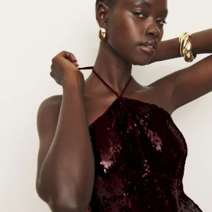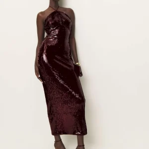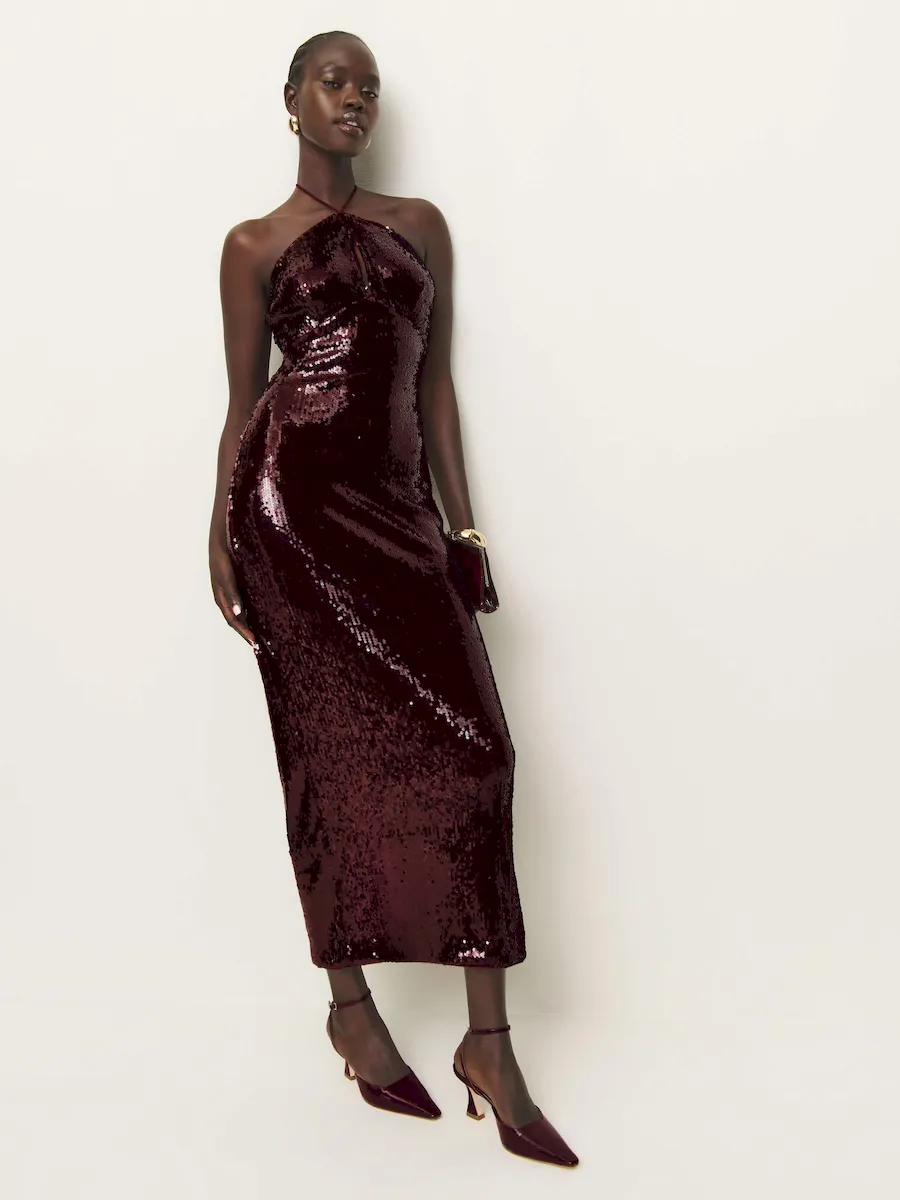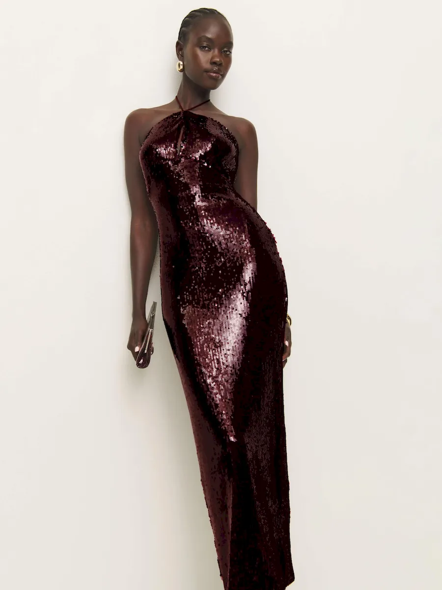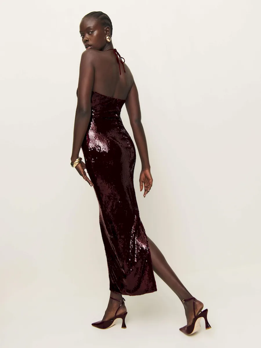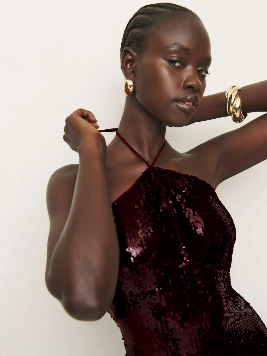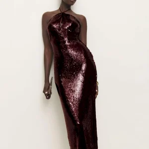 The model is wearing a size 4 and is 5’11”, 26″ waist, 38″ hips, 35″ bust.