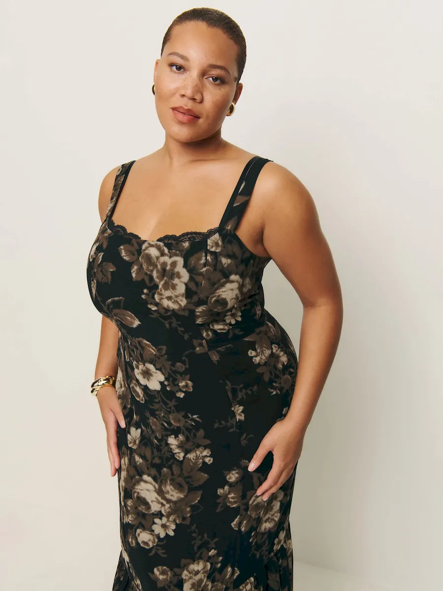 The model is wearing a size 14 and is 5’9″, 34″ waist, 45″ hips, 41.5″ bust.