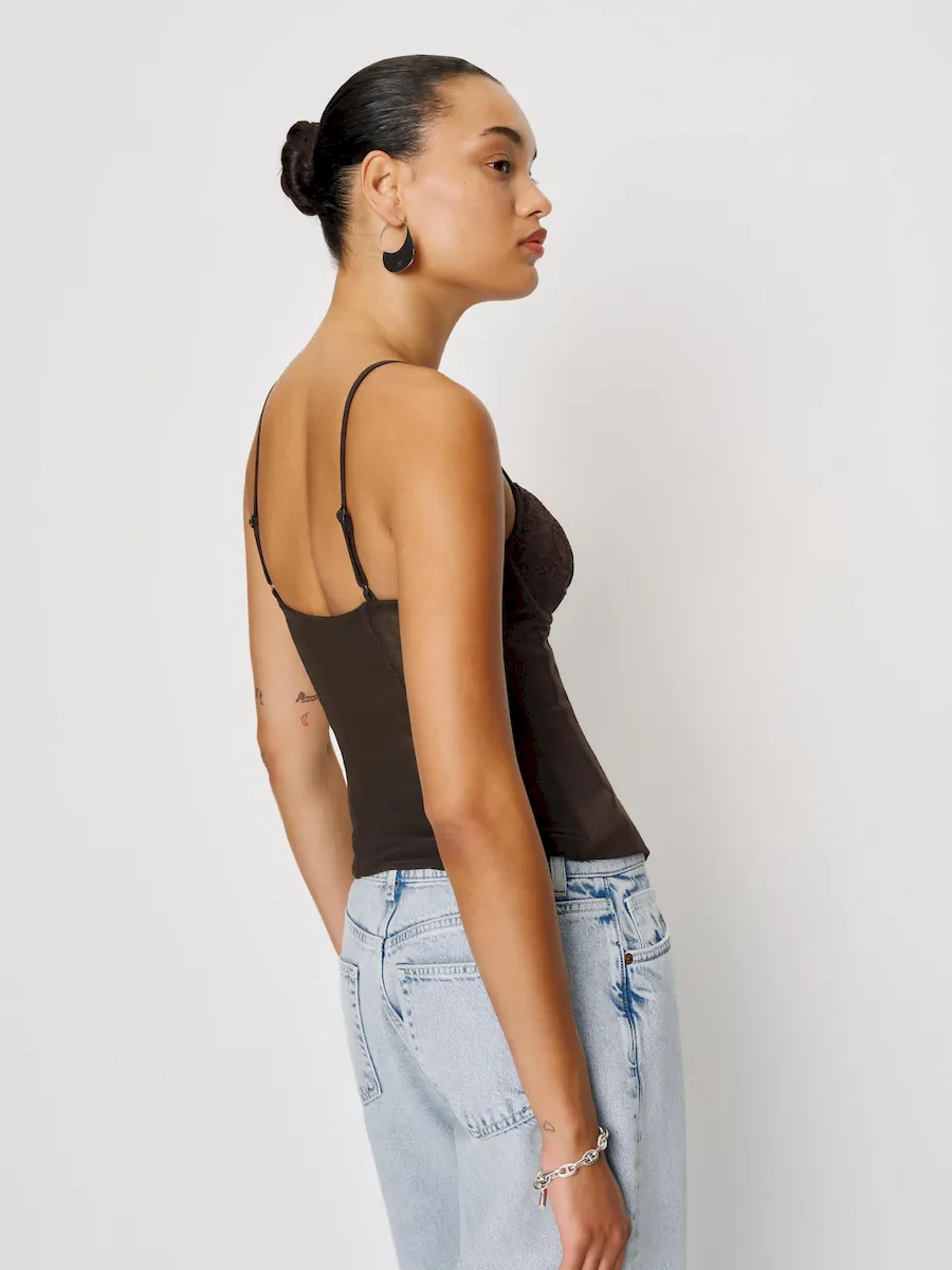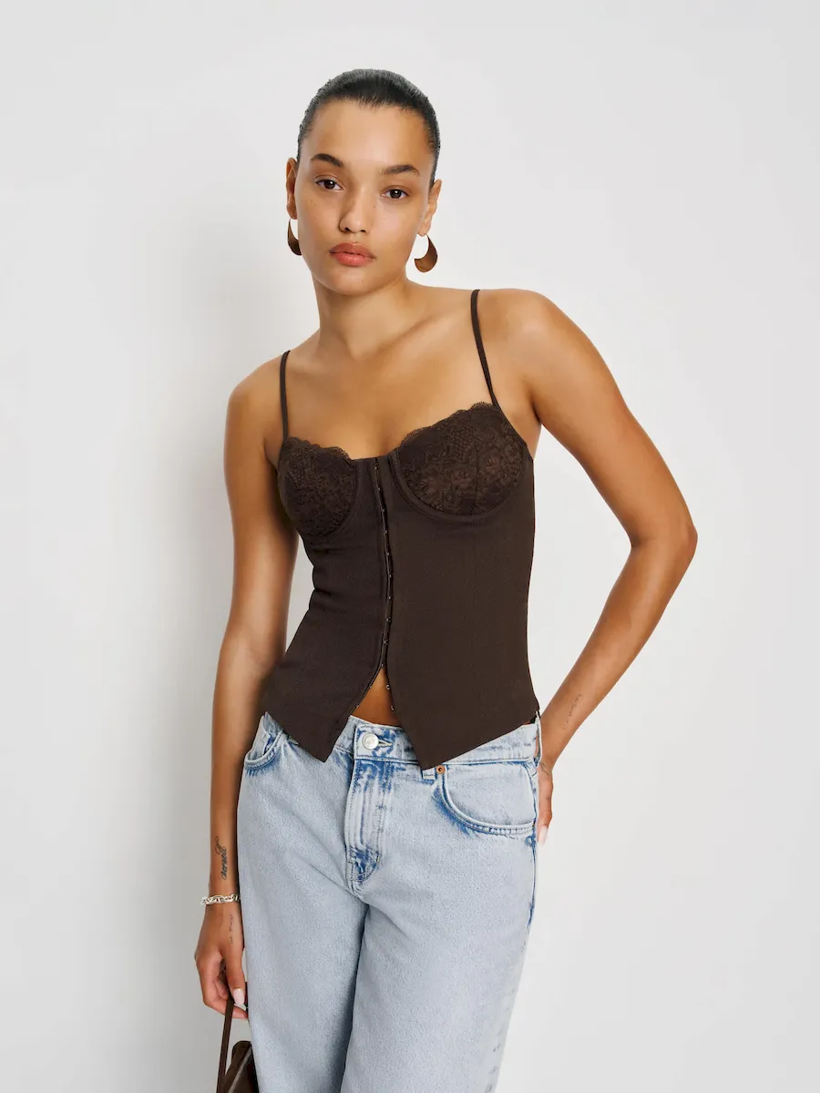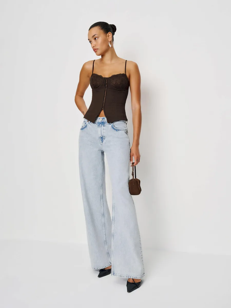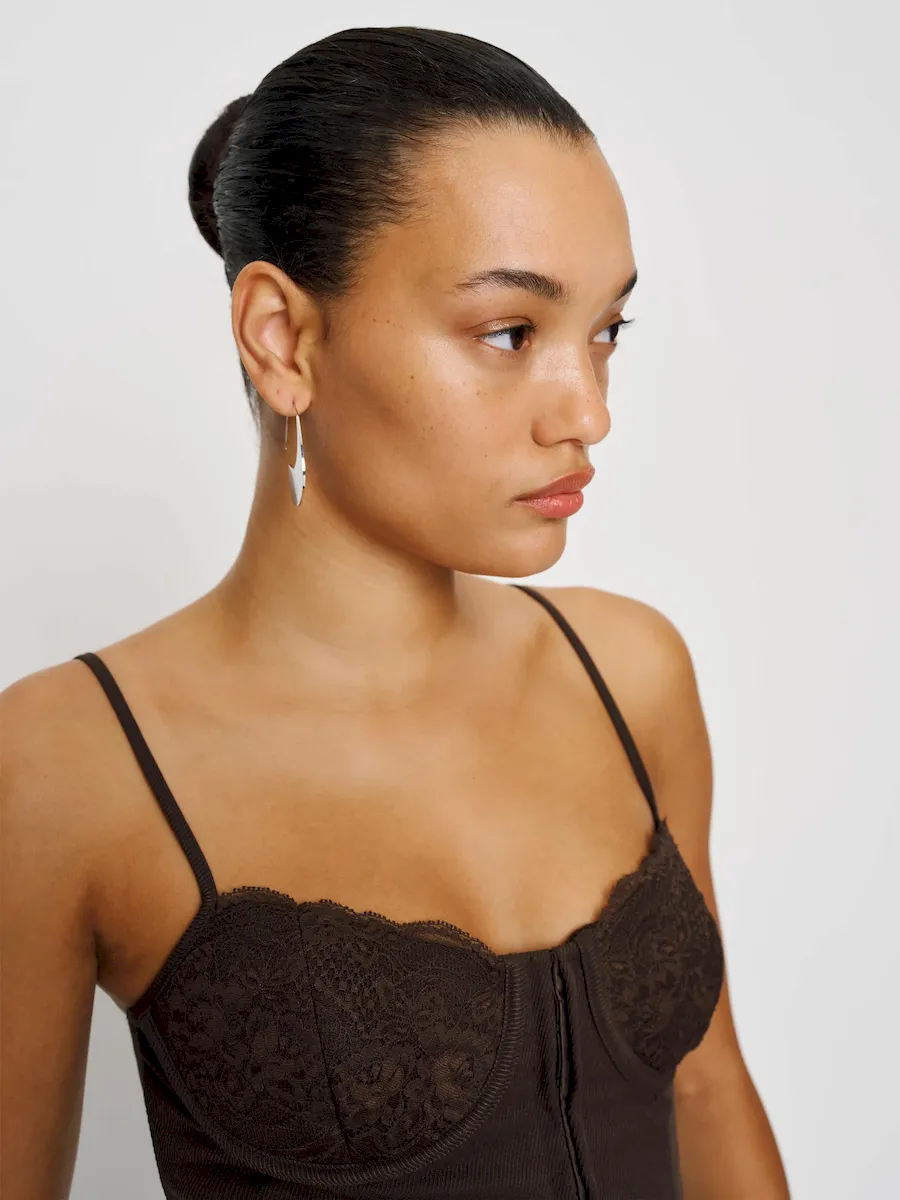 The model is wearing a size 0 and is 5’10”, 23″ waist, 34″ hips, 32″ bust.