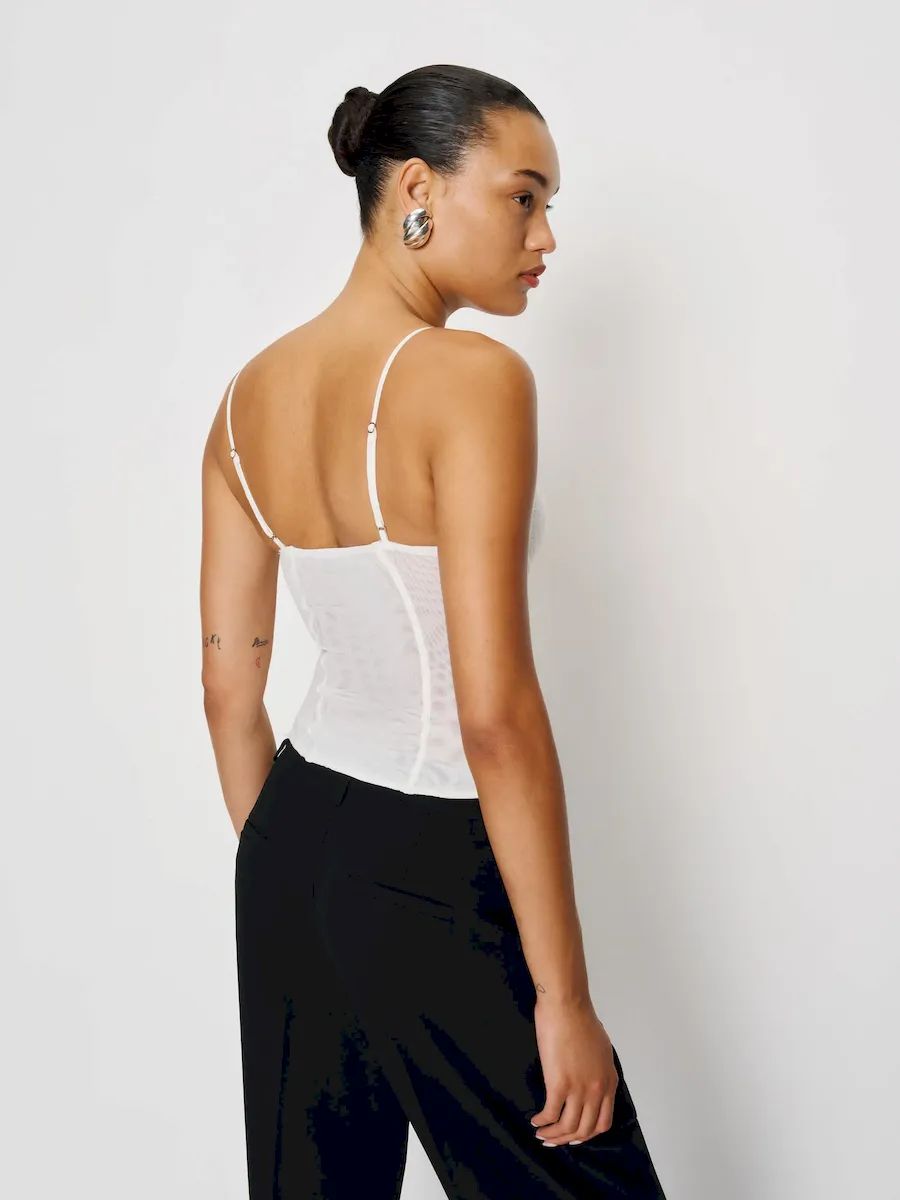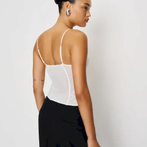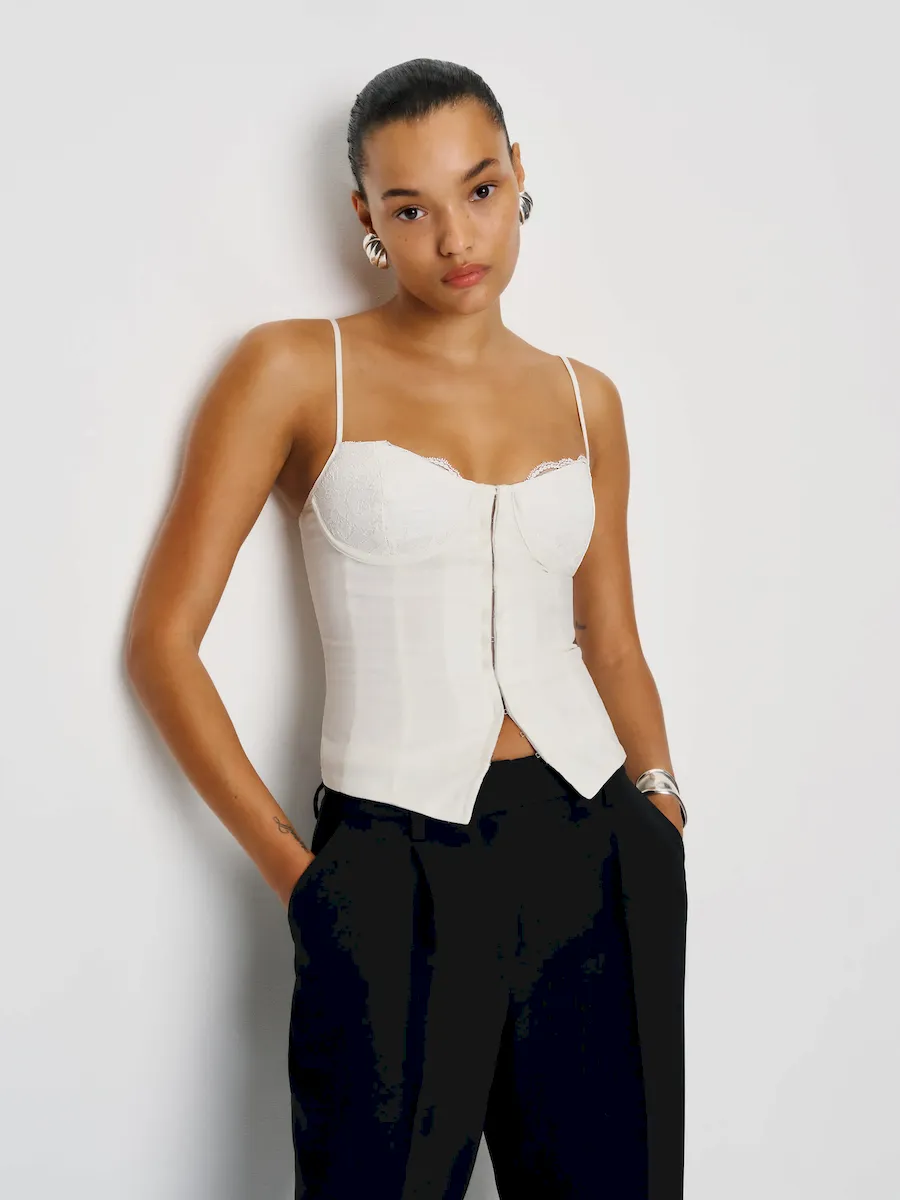 The model is wearing a size 0 and is 5’10”, 23″ waist, 34″ hips, 32″ bust.
