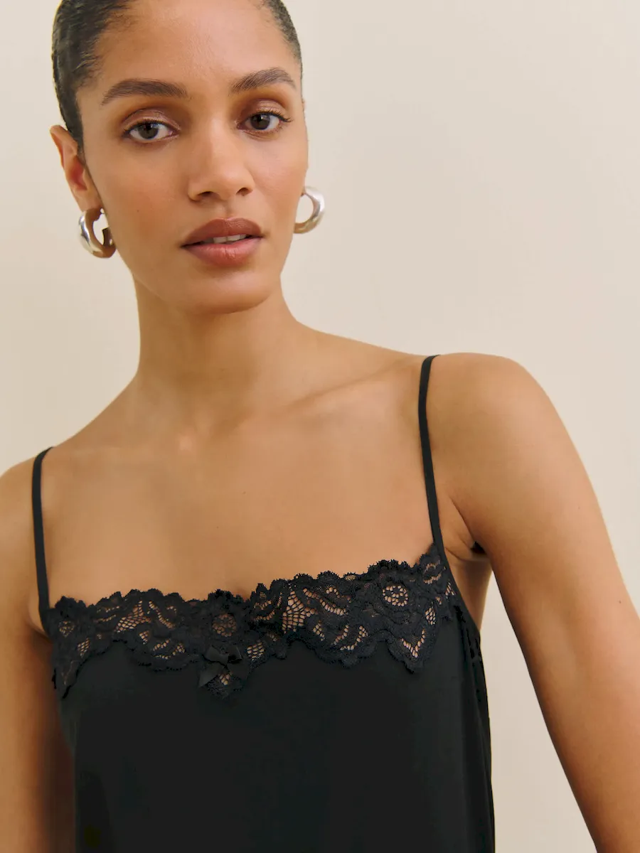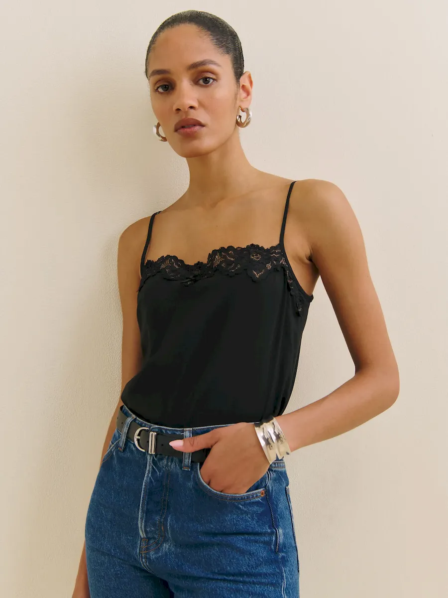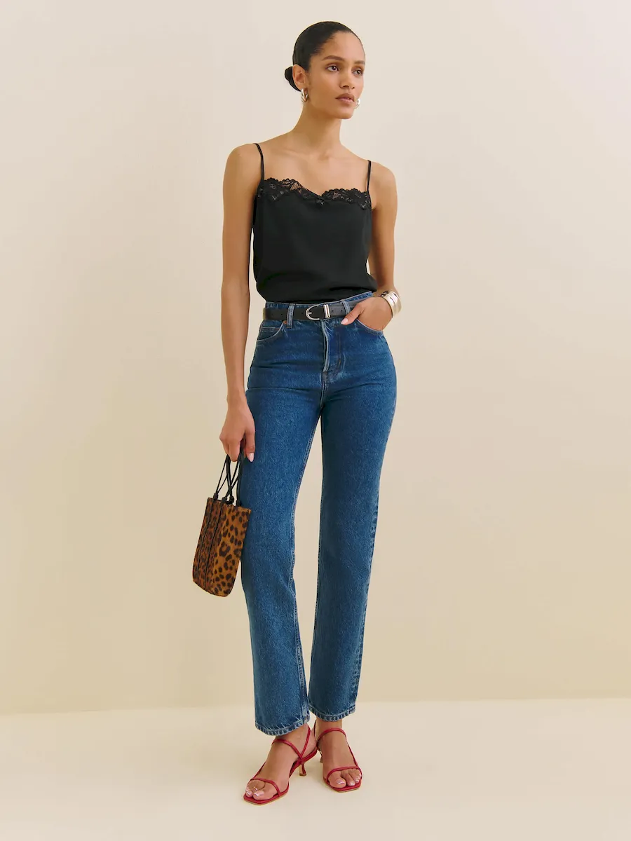The model is wearing a size 0 and is 5’10”, 23″ waist, 35.5″ hips, 32.5″ bust.