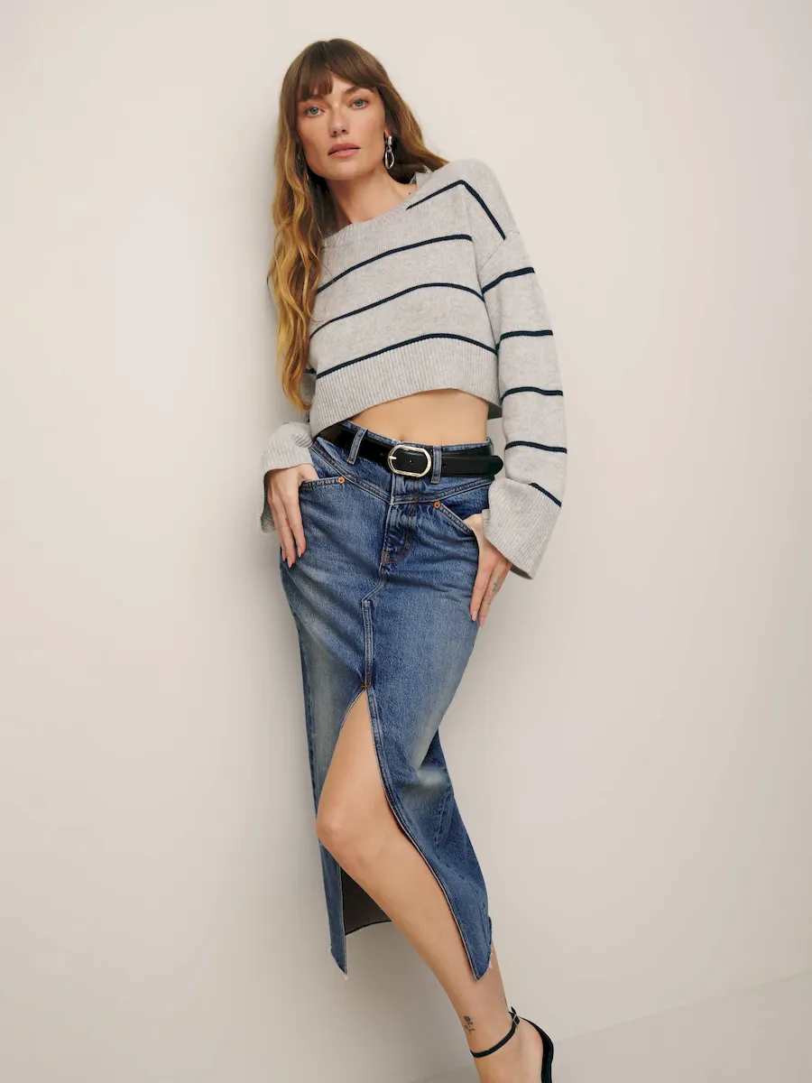 The model is wearing a size 25 and has a 25″ waist, 34.5″ hips.