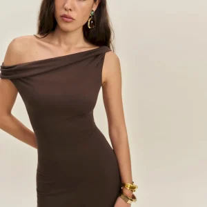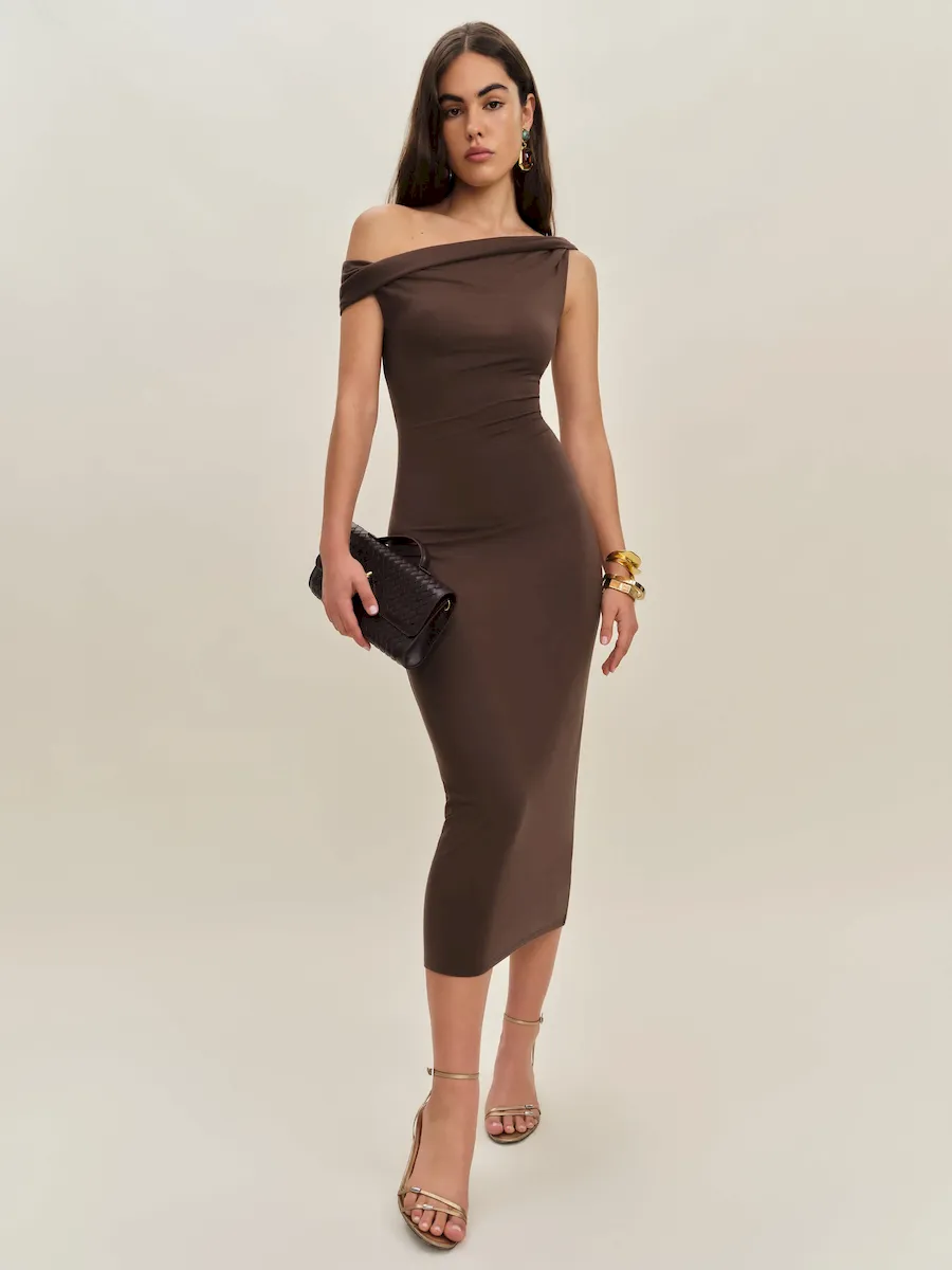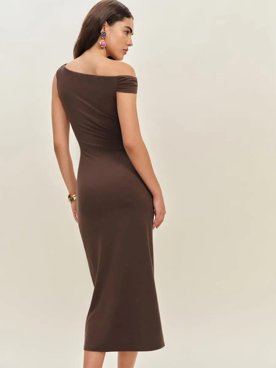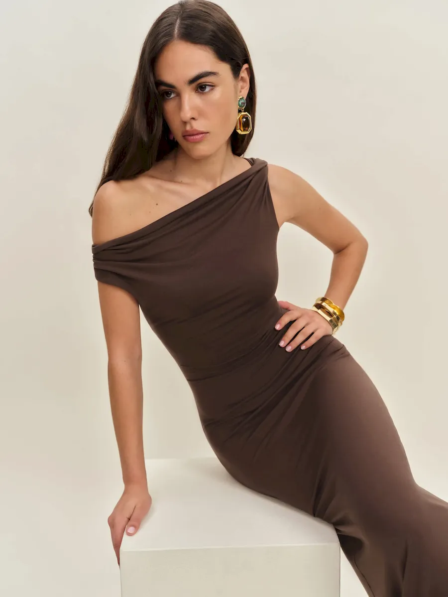 non-adjustable straps, asymmetric neckline.