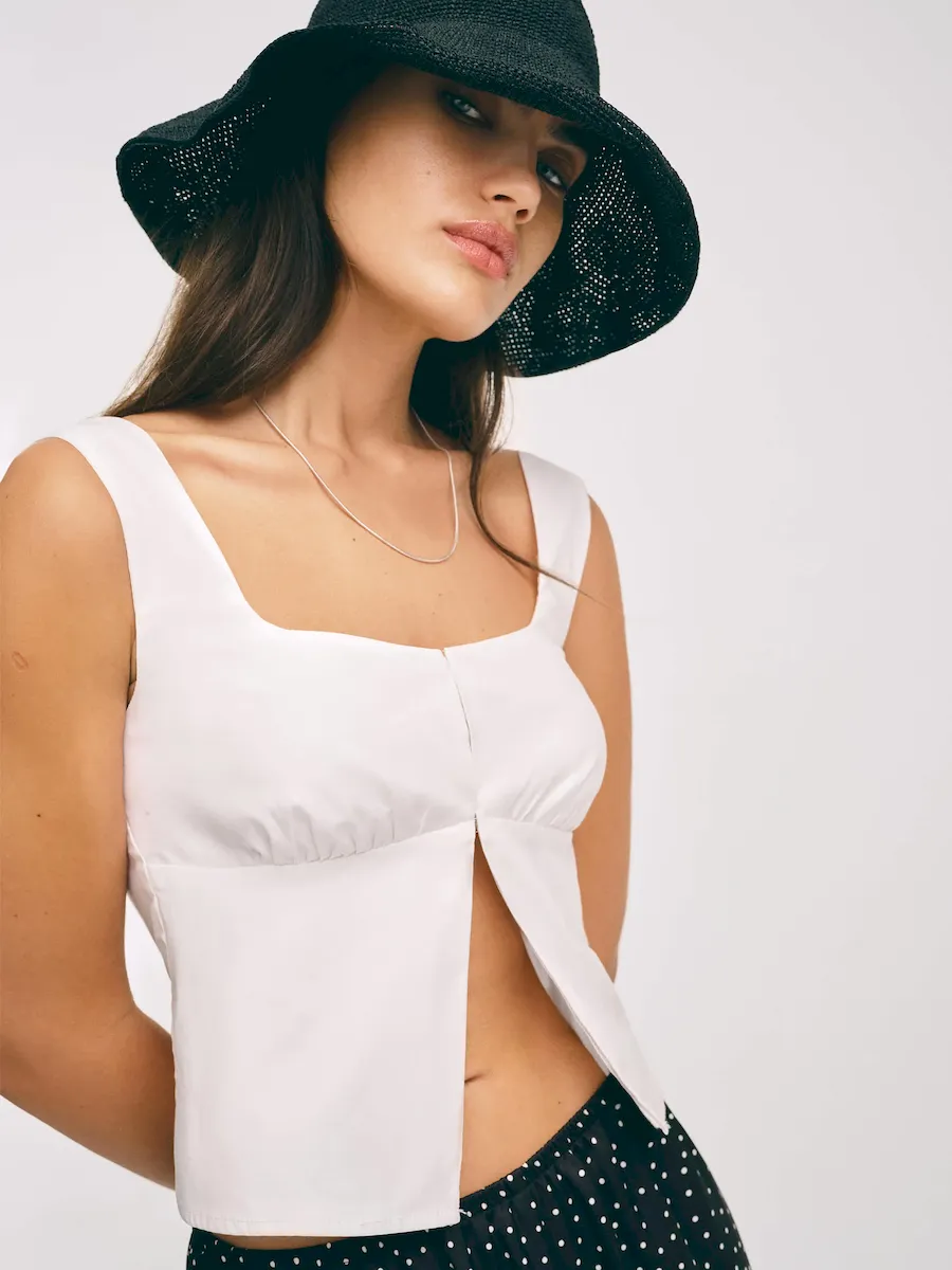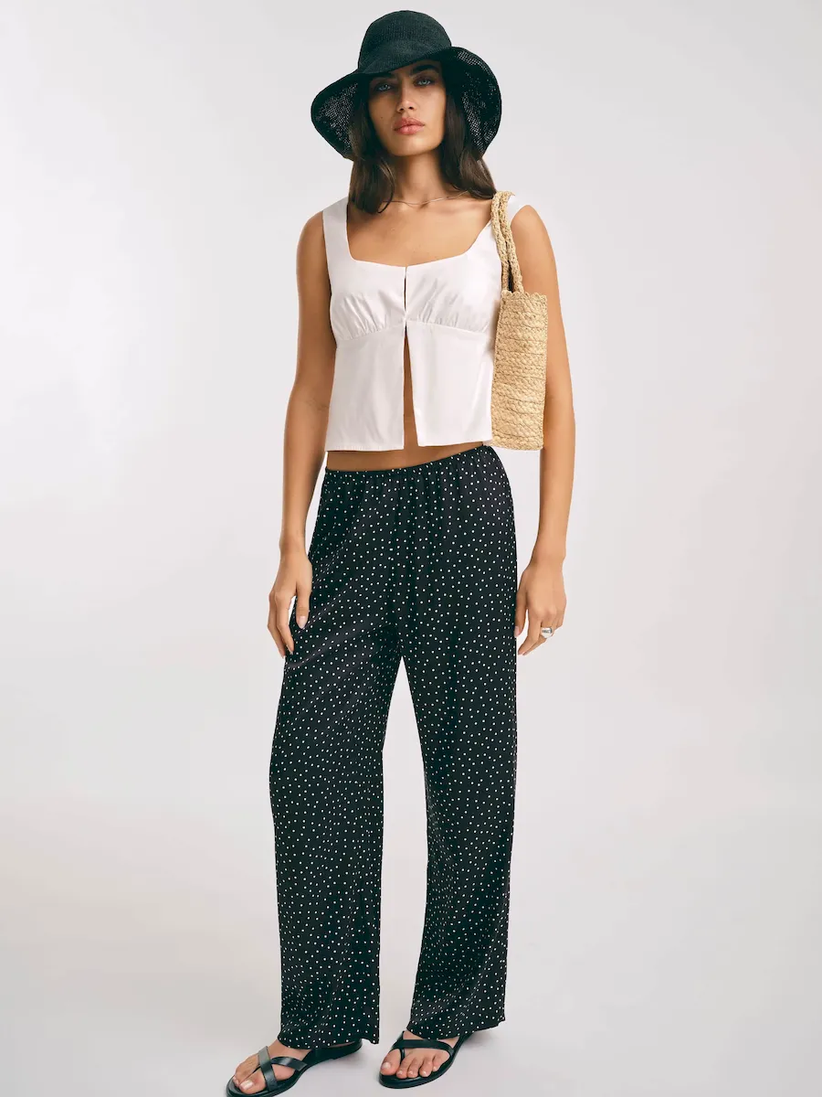 The model is wearing a size 2 and is 5’9.5″, 25″ waist, 36″ hips, 34″ bust.