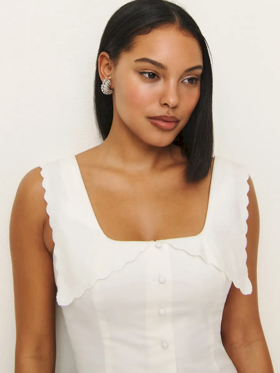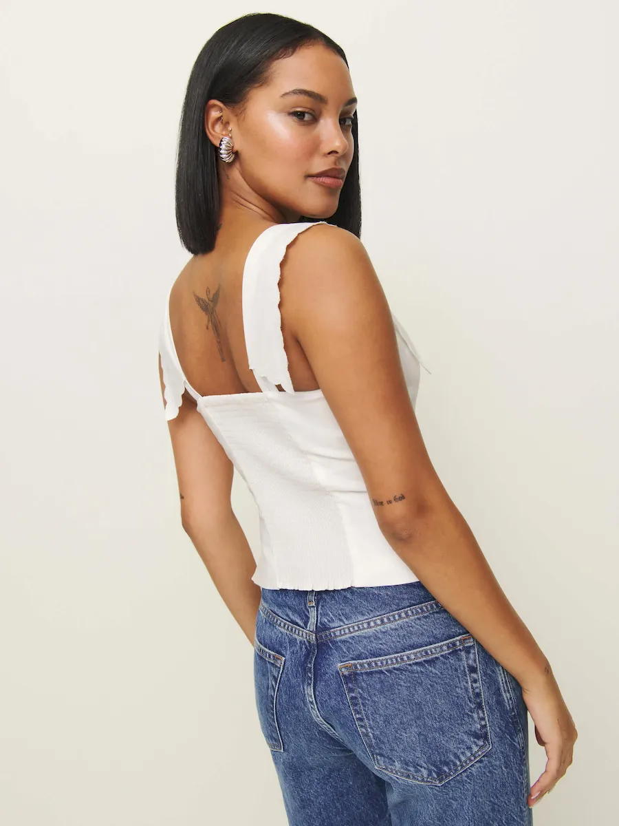 The model is wearing a size 0 and is 5’9″, 23.5″ waist, 34″ hips, 34″ bust.