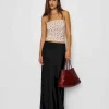 The model is wearing a size 0 and is 5’10”, 24.5″ waist, 34.5″ hips, 31″ bust.